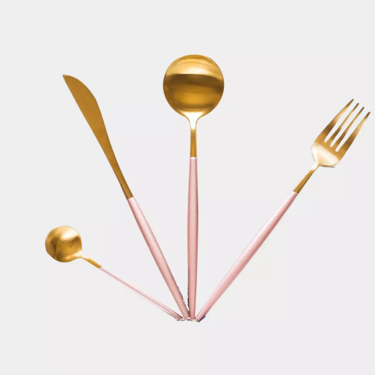 دعي الفخامة تكون عنواناً لتفاصيل مائدتكِ واختاري أدوات طعام بتصميم GOA، والتي تتميز بألوانها الراقية وتصميمها العريق. سيضيف اللون الوردي المتناسق مع الذهبي مستوى جديد من الفخامة والأناقة على مائدتكِ. تتكون مجموعة أدوات الطعام من: