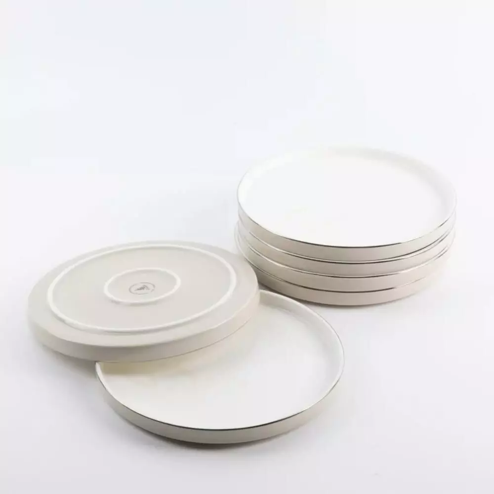 يحتوي الطقم على 6 أطباق كبيرة الحجم لتناسب الضيافة، مزخرفة بخط فضي اللون تحديداََ من على حواف الطبق، تأخذ الأطباق شكل دائري مع عمق بسيط و حواف مرتفعة قليلاََ، مصنوعة من مادة عالية الجودة لكي تتحمل الاستخدام لفترة طويلة من الزمن.