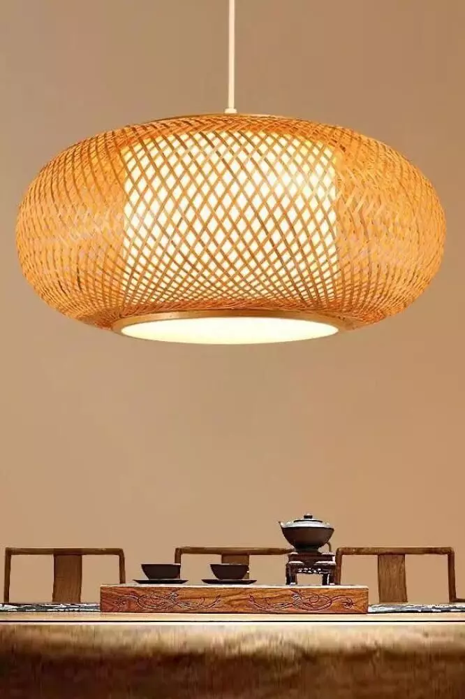 الغطاء الخارجي للمعلّق مصمّم من خامات طبيعية مثل الخيزران أو الخشب المشبّك، مما يعكس طابعًا بيئيًا هادئًا ومتناسقًا مع ديكورات المنازل الريفية أو ذات الطابع البوهيمي.