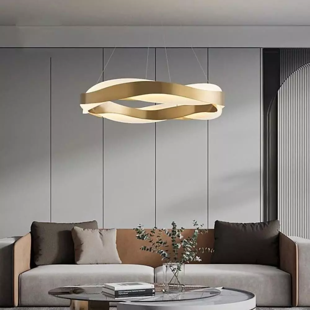 إنارة معلقة مودرن ذهبي مصنوعة من مواد ذات جودة عالية تضمن متانتها واستدامتها على مر الزمن. التصميم المعدني الذهبي يضيف لمسة فاخرة ويعكس الضوء بشكل جميل.