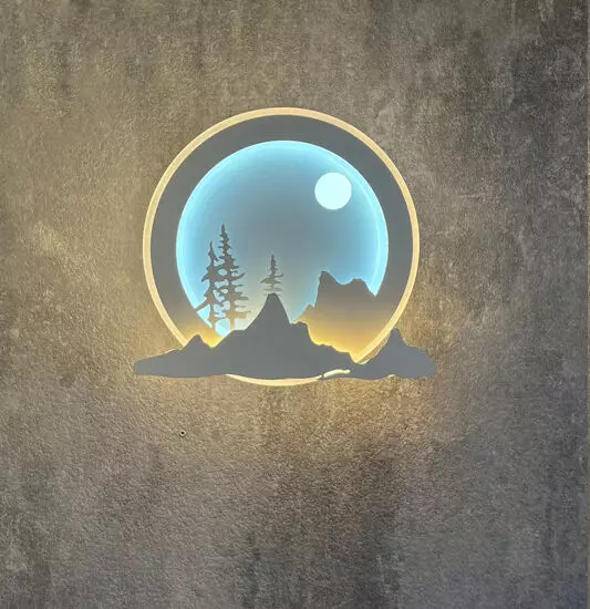 اضاءة جدارية تعمل بالكهرباء نوع الاضاءة strip light مثبته على الحائط على شكل جبال وشجر تحمل اثنان من اللون بمقياس kelvin: تأتي بدرجة 3000k من الخارج، و 6000k من الداخل تستوحي اباليك جداريه من شكل جبال وشجر جمالها من الطبيعة تعكس الجبال والأشجار الهدوء والسكينة والقوة، مما يضفي جوًا طبيعيًا وملهمًا على المساحة تتميز بتصنيع دقيق واستخدام مواد فنية متميزة، مما يجعلها قطعة فنية فريدة ومتين تعمل على إنشاء أجواء دافئة ومريحة في المكان التي تثبت به، وتعزّز الإضاءة العامة الموجودة . درجة حرارة الإضاءة: 3000-6000 كالفن