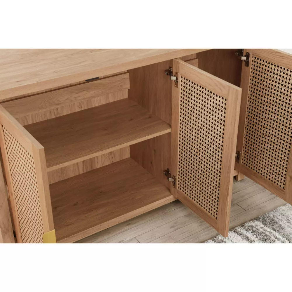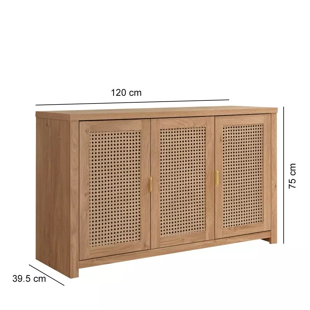 باللون البني الفاتح، طاولة بوفيه جانبية راتان تتناغم مع مختلف أنماط الديكور، مما يجعلها الخيار المثالي لمختلف المساحات المنزلية. إنها قطعة ديكور أنيقة وعملية في آن واحد.