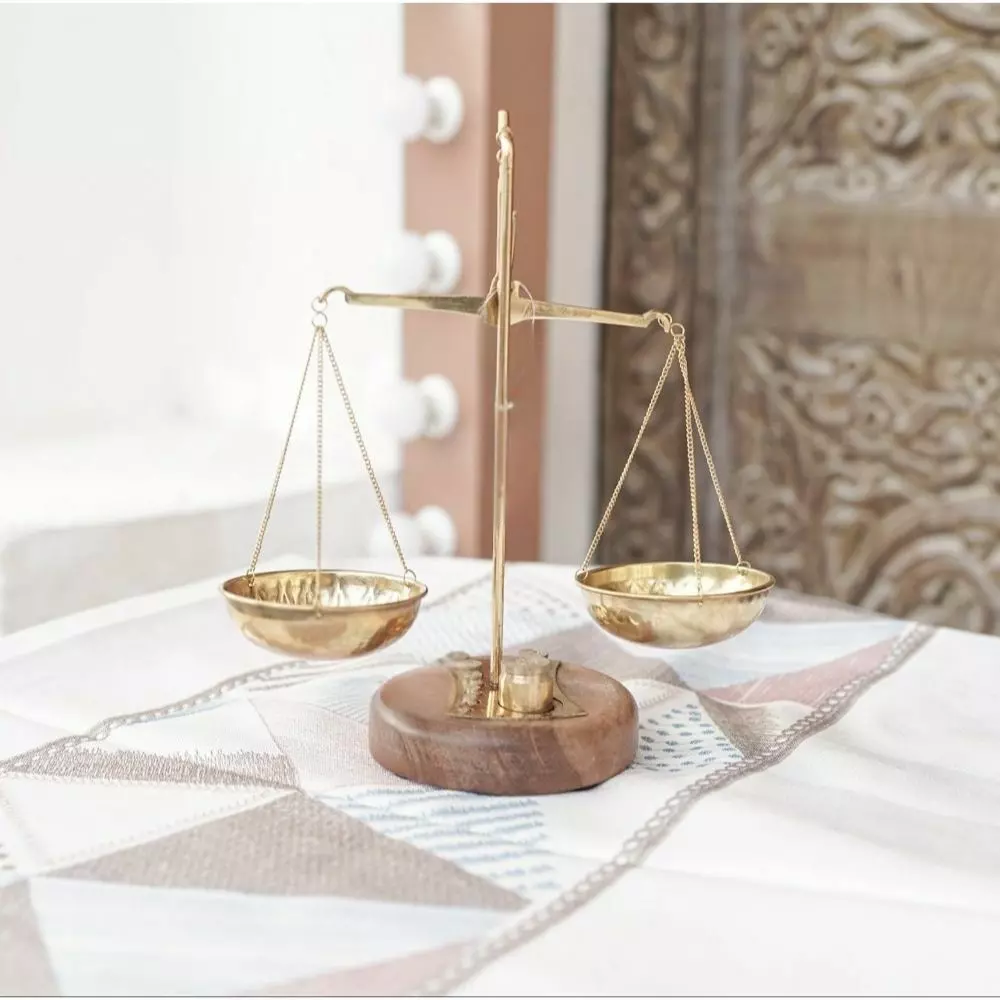 تحفة ديكور مصنوعة من الحديد بتصميم ميزان بقاعدة مصنوعة من الخشب, تستخدم للديكور في مساحات مختلفة لتعزيز جمالية المساحة وإضافة الدفء والشخصية إلى الديكور العام للمنزل.