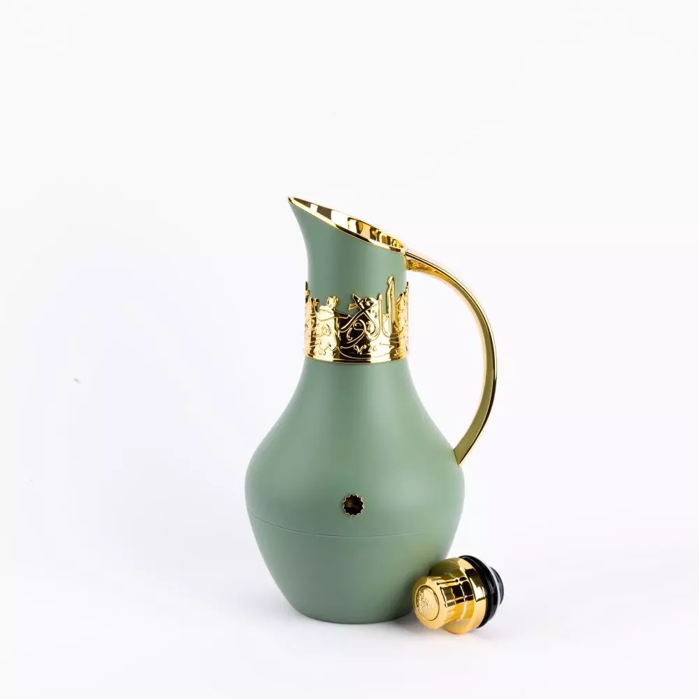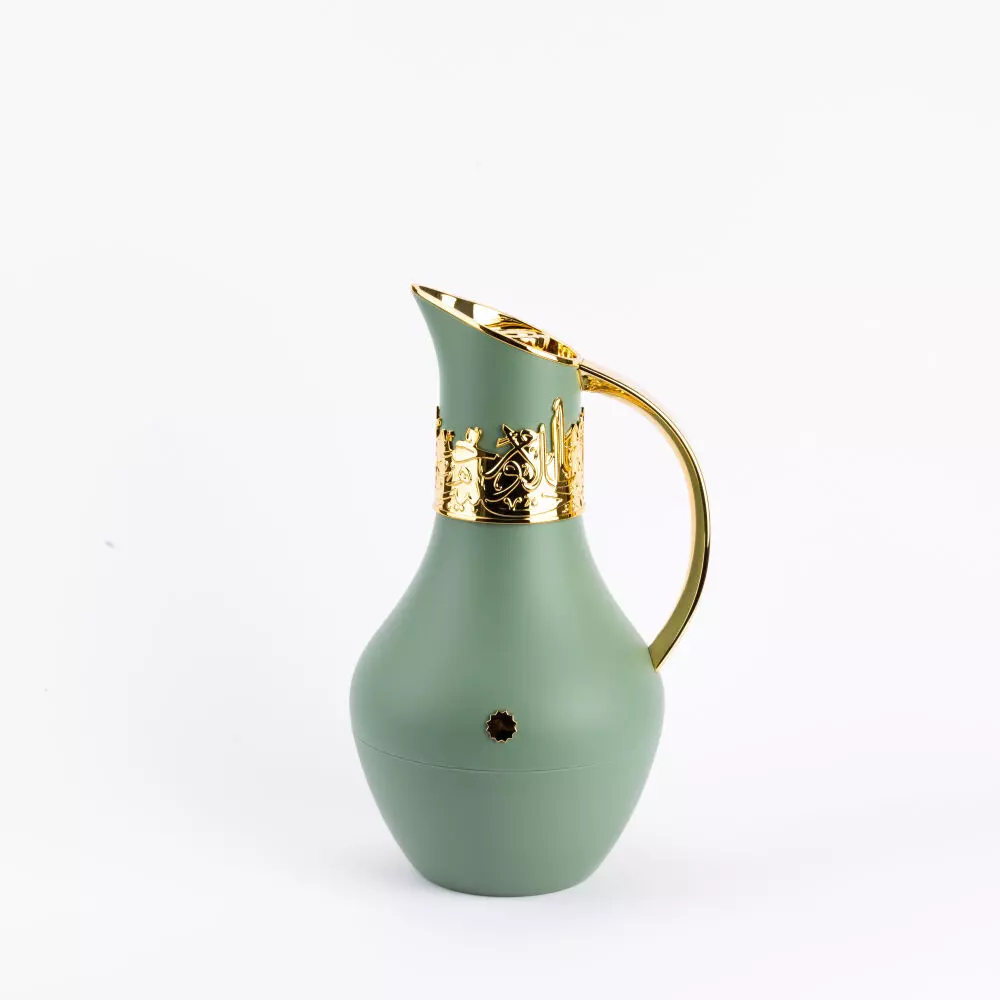 دلة للشاي والقهوة من أثير باللون الزيتي وذهبي مصنوعة من البلاستيك.