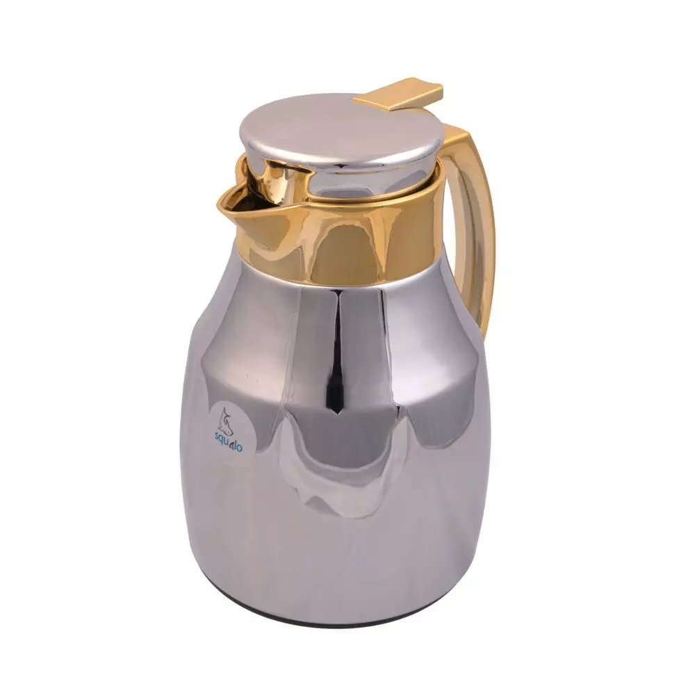ترمس شاي بسعة 0.5 لتر بلون ذهبي وفضي مصمم لحفظ حرارة المشروبات، مما يجعله خيارًا مثاليًا للاستخدام في المناسبات والضيافة.