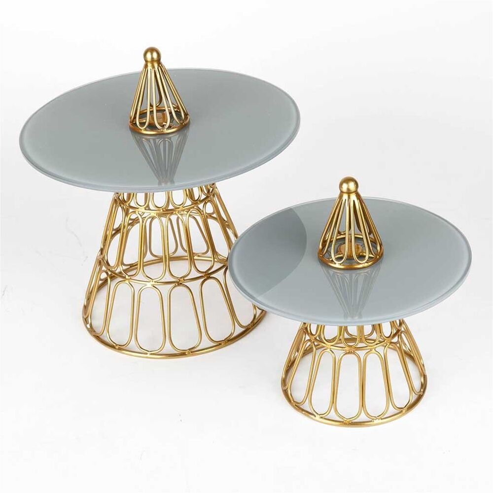 ابهري ضيوفك بحامل كيك فاخر بتصميم عصري راقٍ، يأتي بسطح زجاجي ملوّن وقاعدة ذهبية أنيقة، ليمنح طاولتك لمسة لافتة تُكمّل جمال مناسباتك.
