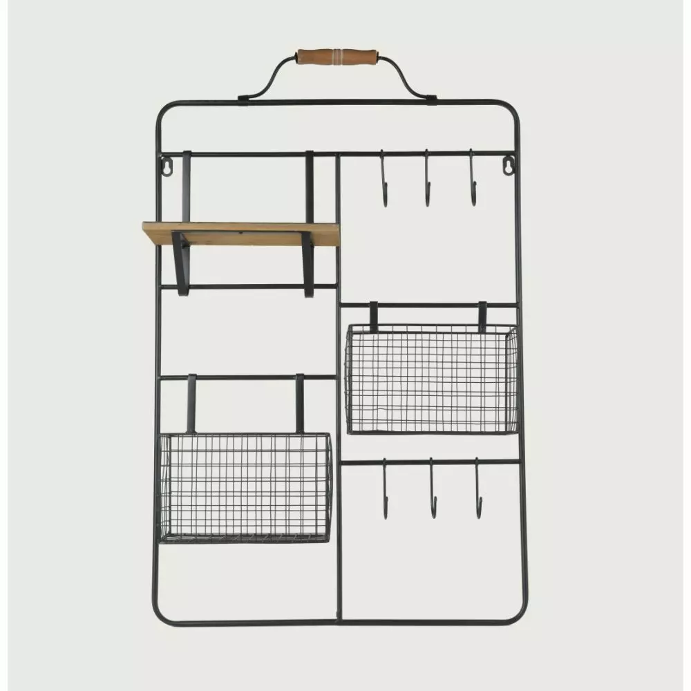 رف خشب وشبك وعلاقة لون اسود مع الرف الخشبي هذا يمكنك ترتيب المستلزمات المنزلية بشكل أنيق وتوفير المساحة في نفس الوقت, تساعدك الشبك والعلاقات على ترتيب كافة المستلزمات