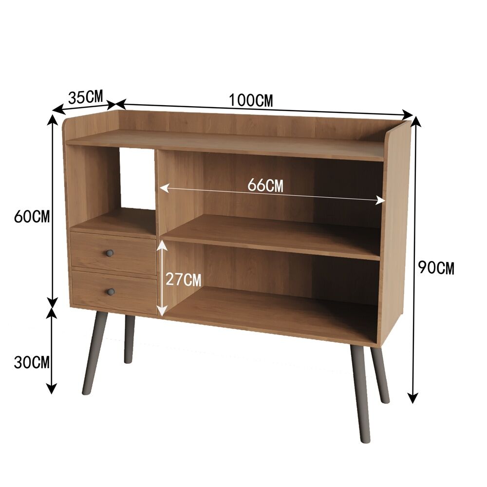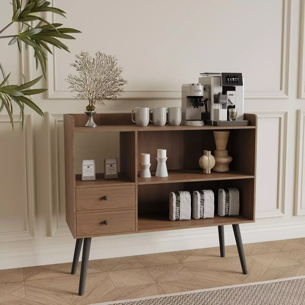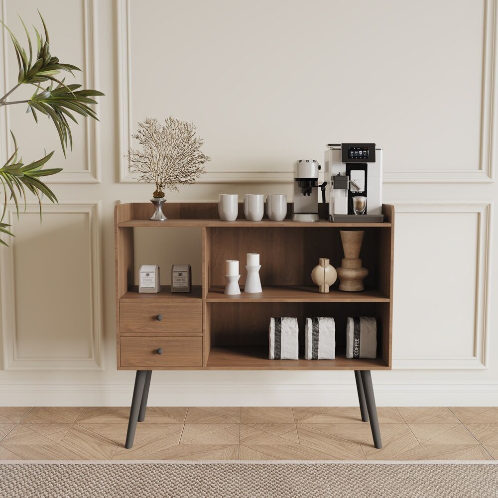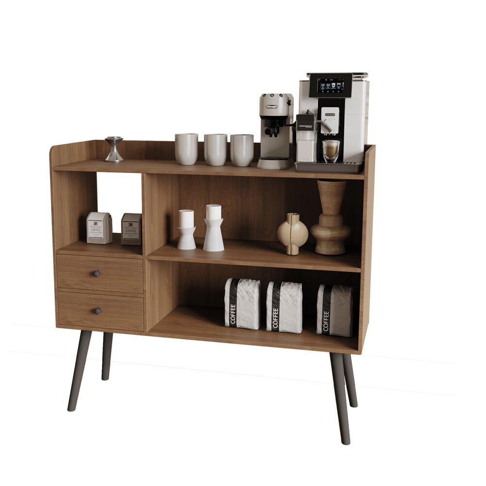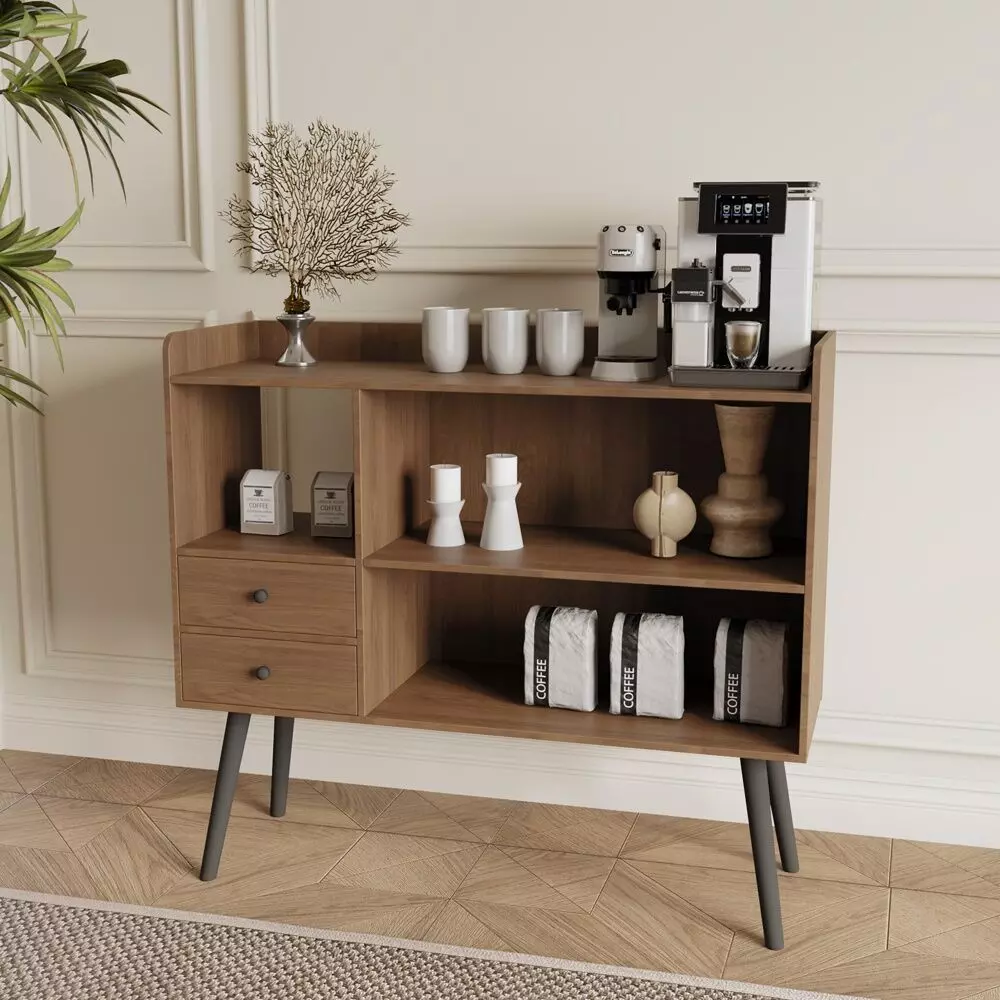 مساحة سطح العمل الكبيرة تتناسب مع الخزائن والأدراج السفلية المفتوحة. سعة التخزين الفائقة مثالية للمكتب أو ركن القهوة في المنزل.