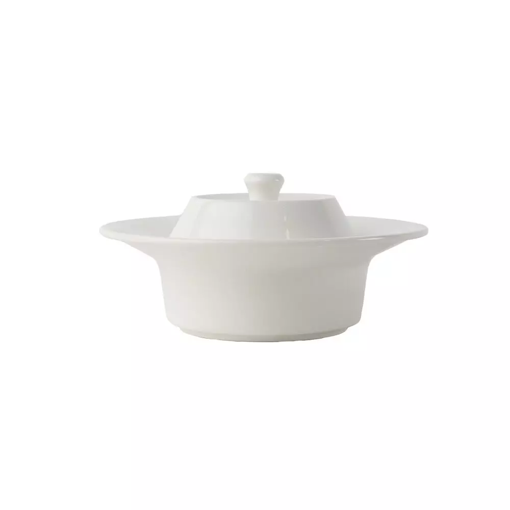 زبدية دائرية الشكل مصنوعة من البورسلان باللون الأبيض مع غطاء لتخزين الطعام بشكل فعال ومحافظة على حرارته.