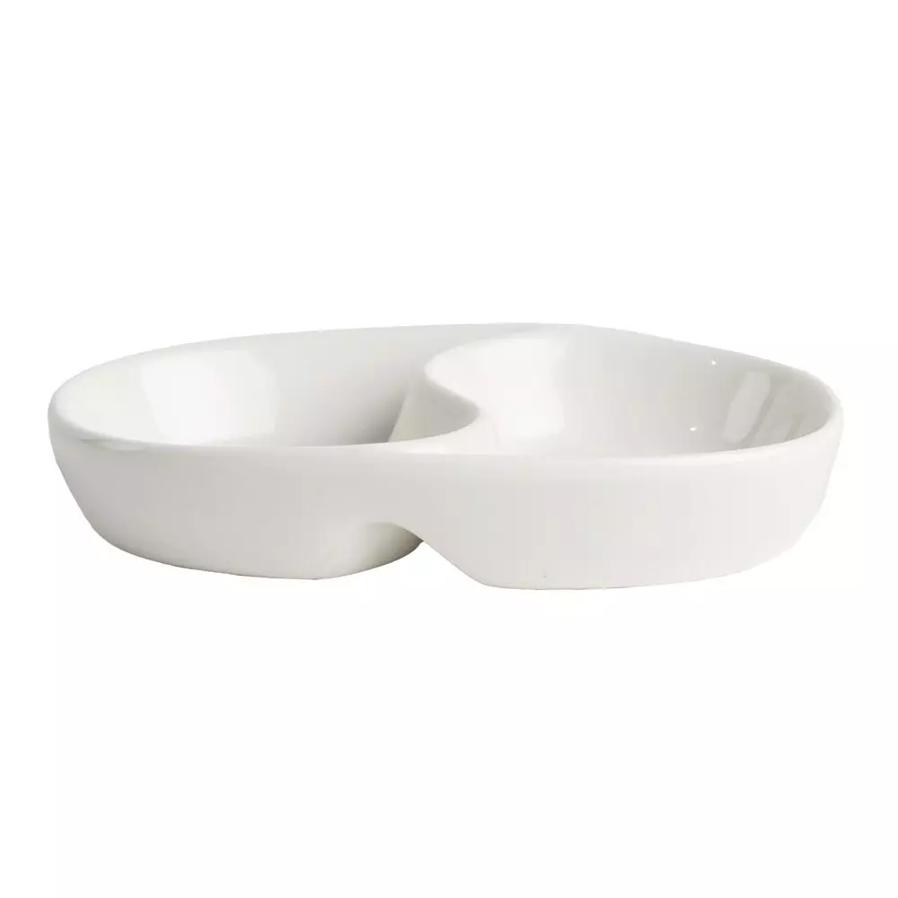 زبدية مقسمة إلى قسمين دائرية الشكل مصنوعة من البورسلان باللون الأبيض، مناسب لإحتواء مختلف الأصناف وهو إختيار مثالي لتقديم وتنسيق الأطعمة بشكل جميل ومنظم.
