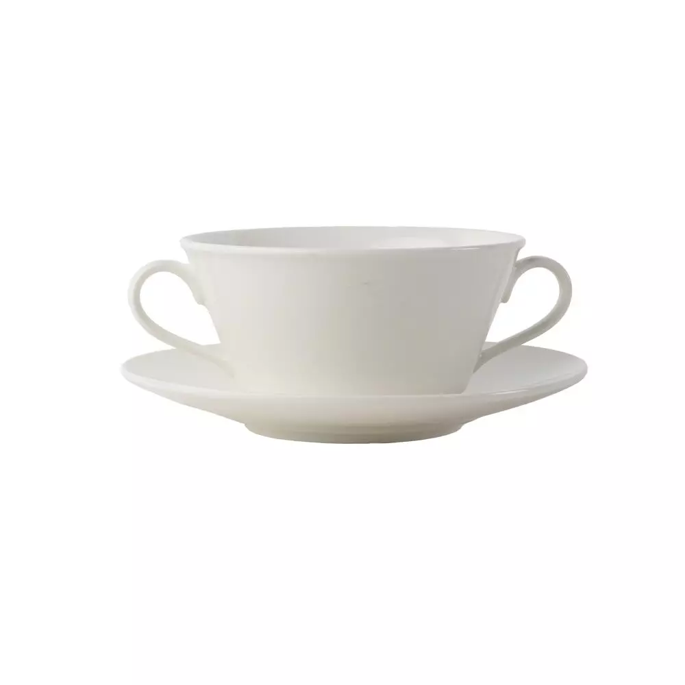 زبدية شوربة دائرية مصنوعة من البورسلان مع طبق ومقابض لتوفير راحة وسهولة في الإستخدام.
