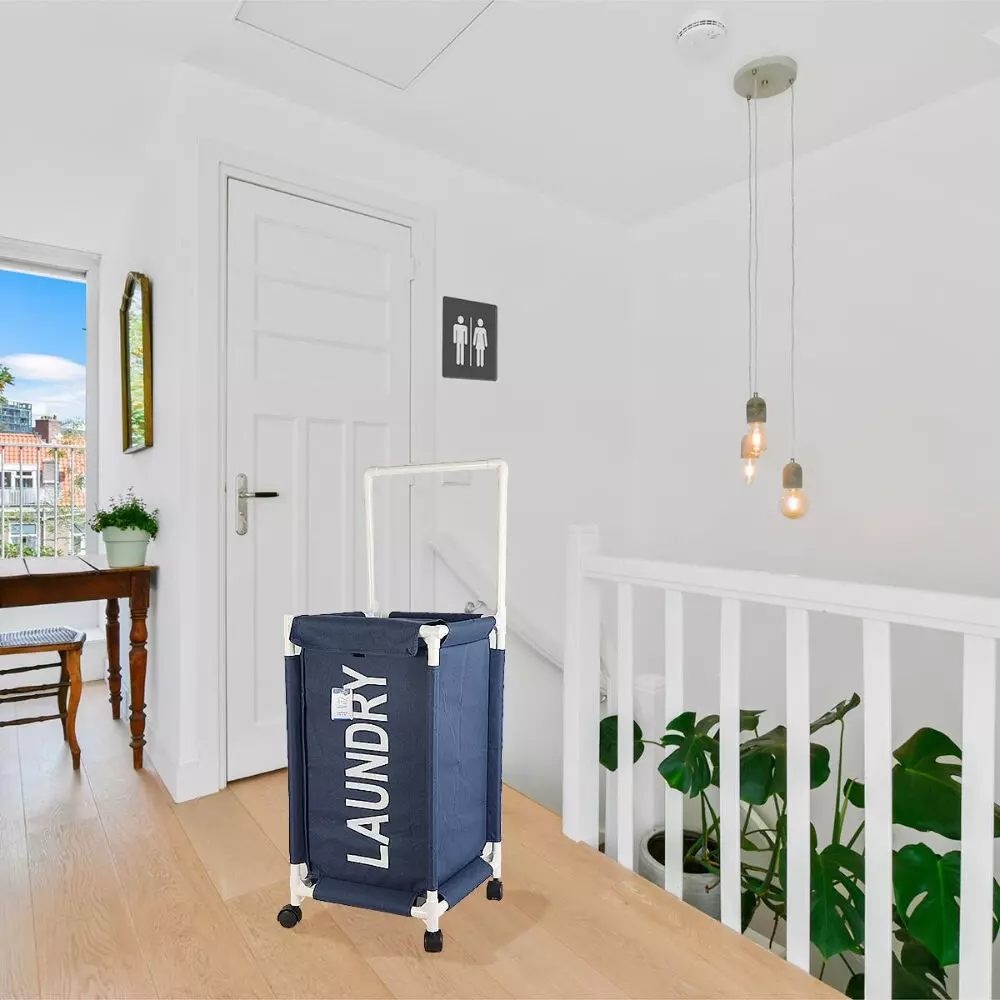 سلة غسيل بعجلات ويد - أزرق غامق سلة غسيل بتصميم راقي تمثل اضافة عملية لاكسسوارات الحمام الخاصة بك تساعدك على تنظيم الملابس عند الغسيل بشكل مرتب وأنيق. مصنوعة من أجود الخامات المتينة والمقاومة للعوامل الخارجية.