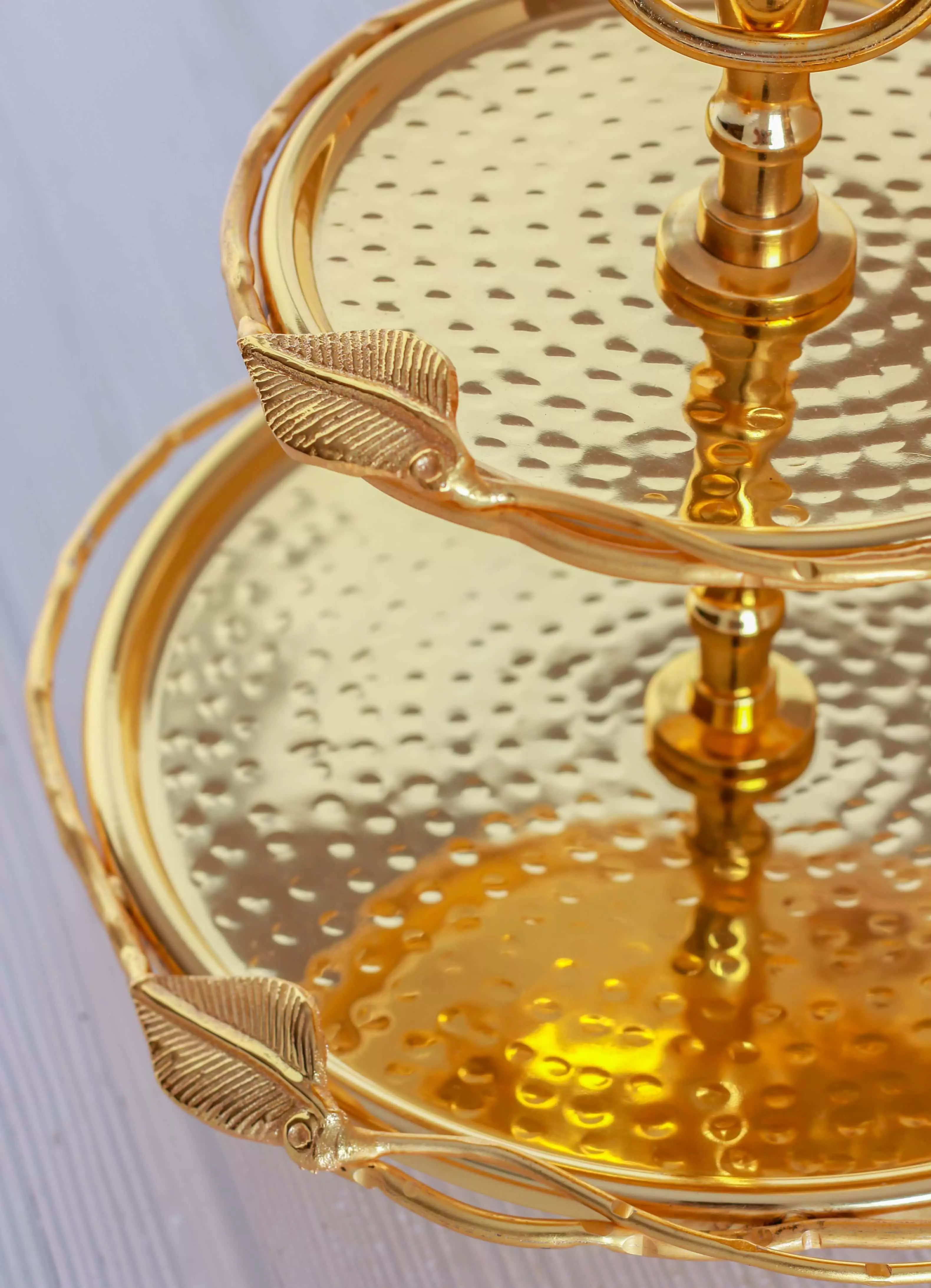 شيال تقديم جوانا الفاخر بتصميم عصري انسيابي يشكل إضافة مثالية لمائدة التقديم الخاصة بك. الشيال مصنوع من الستيل الهندي المتين والعالي الجودة كما هو معروف عن المعادن الهندية الأصلية. الشيال مصنوع ومصمم يدوياً من قبل الحرفيين الهنود المهرة. الشيال مزين بعروق معدنية وأوراق محفورة بعناية ومهارة تعطيه لمسات جذابة. الشيال ثنائي الطبقات مما يسمح لك بتقديم انواع مختلفة من الضيافة أو الشوكولاه أو الكاب كيك وغيرها ومزود بقاعدة تؤمن ثباته على طاولة التقديم وحلقة في أعلاه تسهل حمله وتقديم الضيافة.