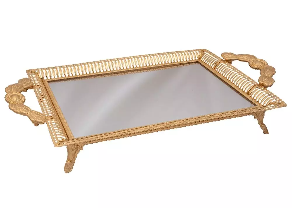 صينية تقديم باللون الذهبي تضفي لمسة فاخرة وعصرية لأي مناسبة. تصميمها الأنيق يجعلها مثالية لتقديم المشروبات أو الحلويات، كما يمكن استخدامها كقطعة ديكور مميزة تضيف لمسة من التألق لأي مساحة.