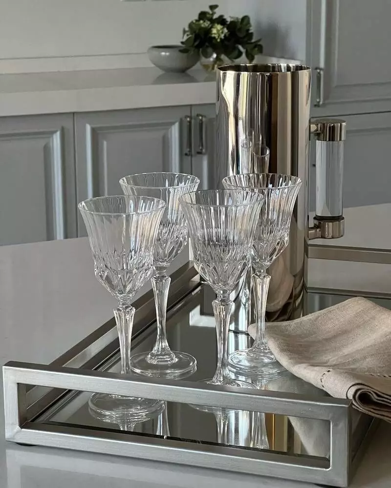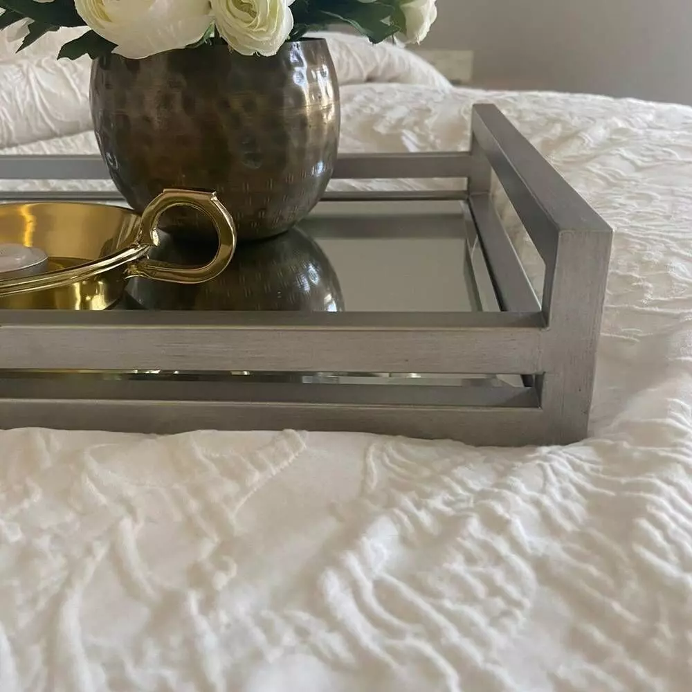 صينية مستطيلة مع مرآه اضيفي صينية تقديم مستطيلة جذابه ذات طراز فرنسي الى مجموعه صواني تقديم الخاصه بك . تأتي الصينية بشكل مميز ومصنوعه بتشطيب من المعدن و زجاج عاكس مما يجعلها قطعه فنية مثاليه لتزيين خزانه الاواني الخاصه بك .اللون : رمادي فضي المقاس: 50X39 سم