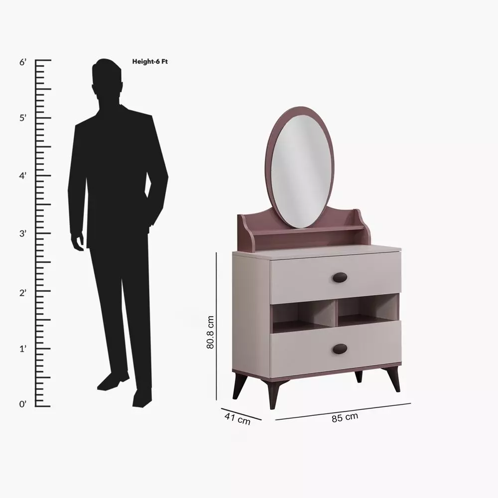 طاولة تزيين الوزن: 44.7 كجم- العمق: 41 سم - الارتفاع: 80.8 سم - العرض: 85 سم مرآة العمق: 1.8 سم - الارتفاع: 68.2 سم - العرض: 40 سم |