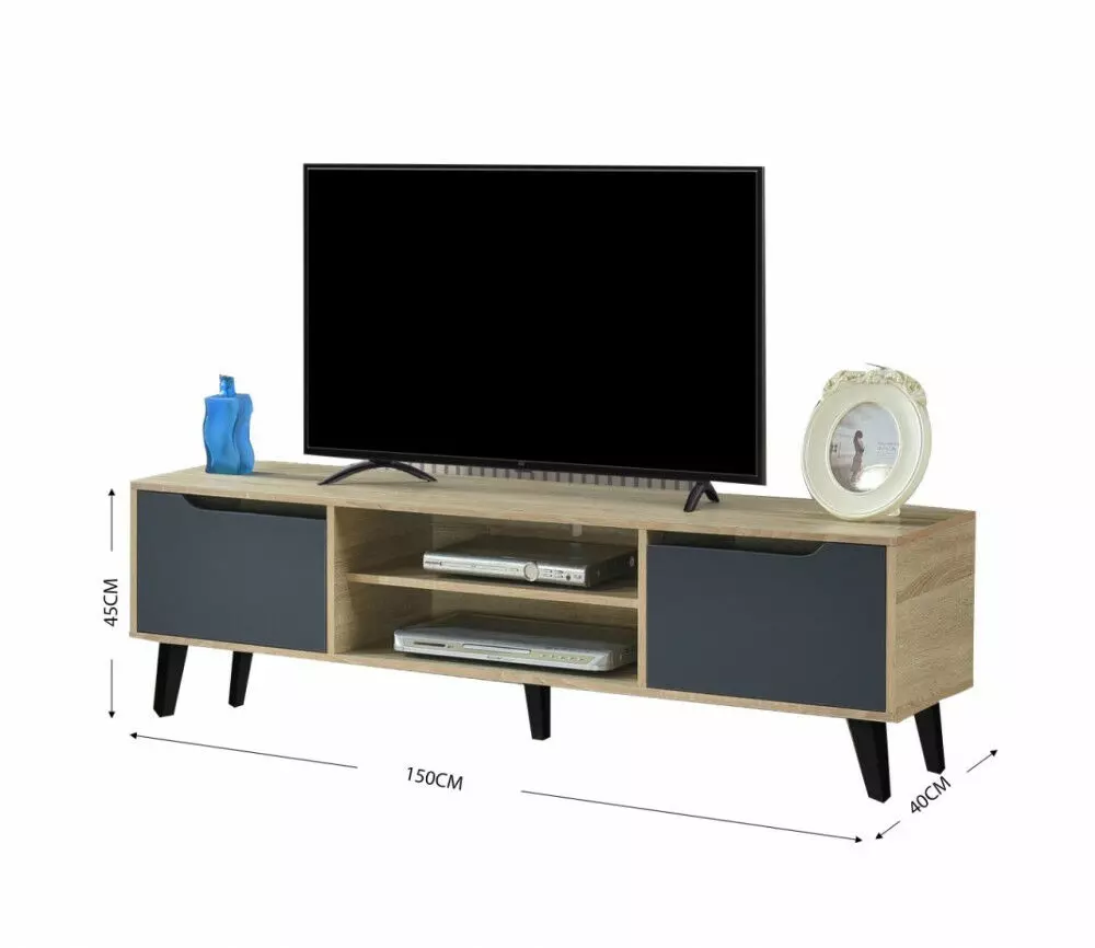 | أبعاد طاولة التلفزيون | العرض: 150 سم، العمق: 40 سم، الارتفاع: 45 سم |