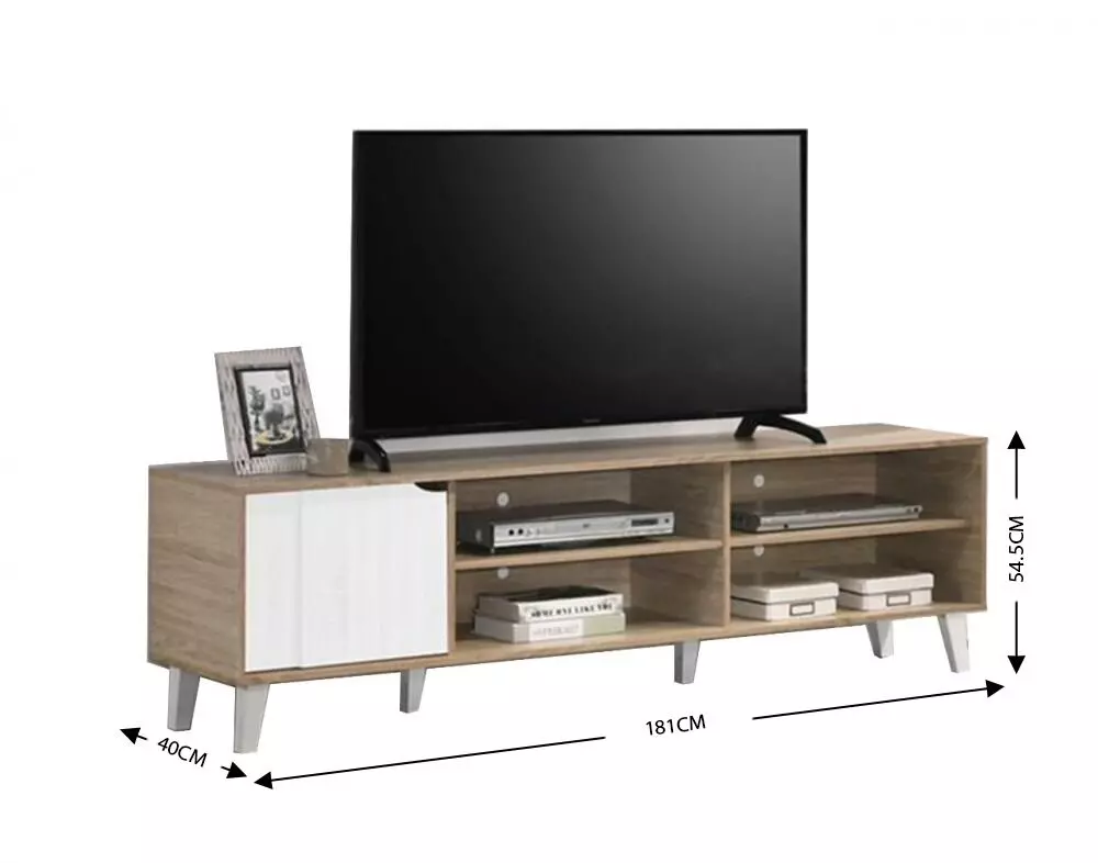| أبعاد طاولة التلفزيون | العرض: 181 سم، العمق: 40 سم، الارتفاع: 54.5 سم |