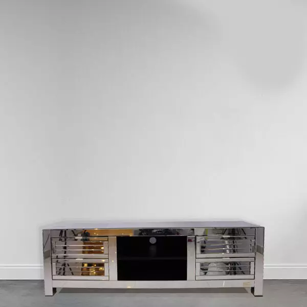 طاولة تلفزيون بلازما هي قطعة أثاث عصرية وفاخرة تستخدم لوضع التلفزيون ووسائل الترفيه الأخرى في غرفة المعيشة أو غرفة التلفزيون. تأتي المكتبة بتصميم عصري وفاخر يتميز بالبساطة والأناقة، مما يجعلها متناسبة مع مختلف أنماط الديكور تحتوي على أبواب زجاج مرآة تسمح بإظهار وإخفاء محتويات المكتبة وتعكس الضوء لإضفاء البعد والتوهج على المكان.