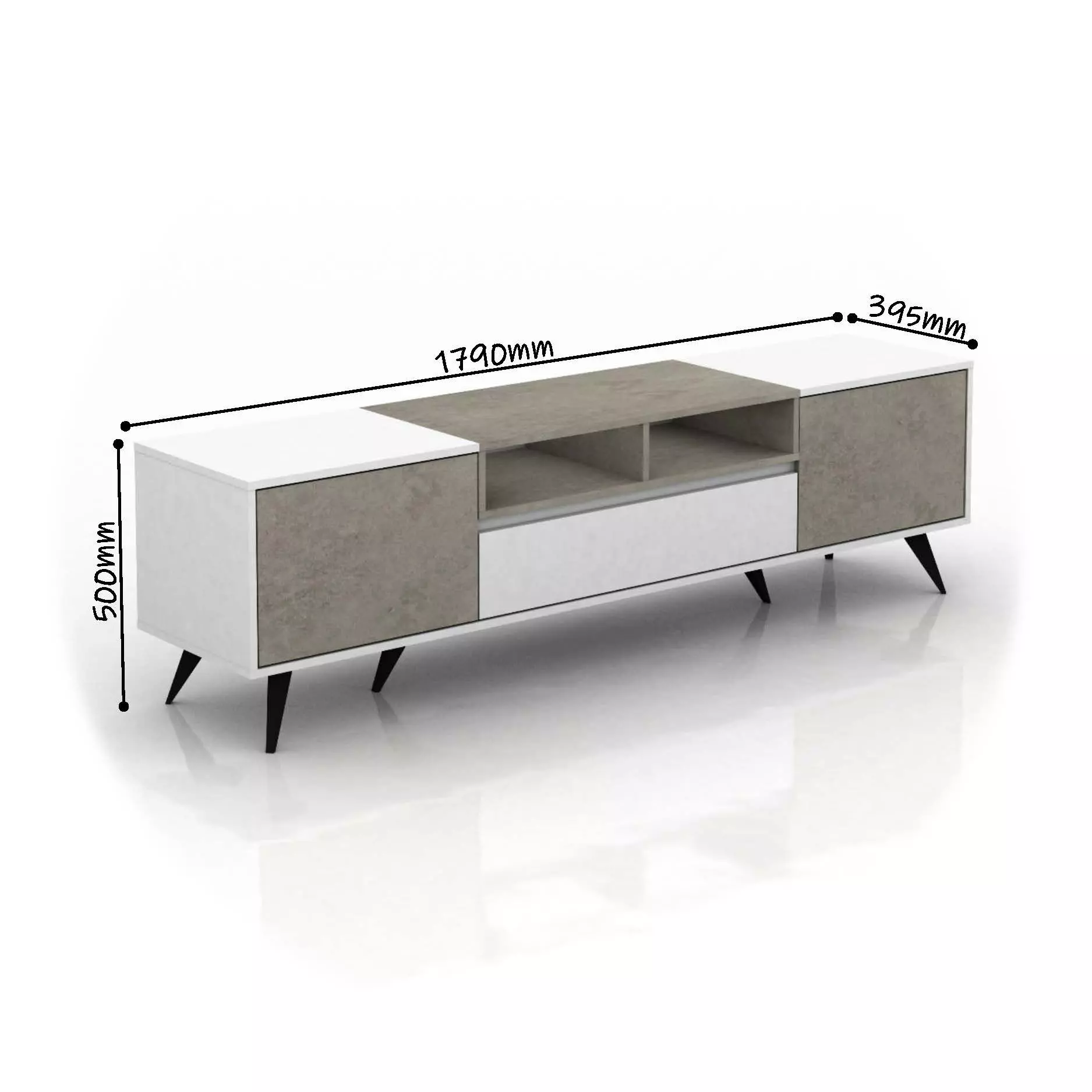 أبعاد طاولة التلفزيون العرض: 179 سم، العمق: 39.5 سم، الارتفاع: 50 سم