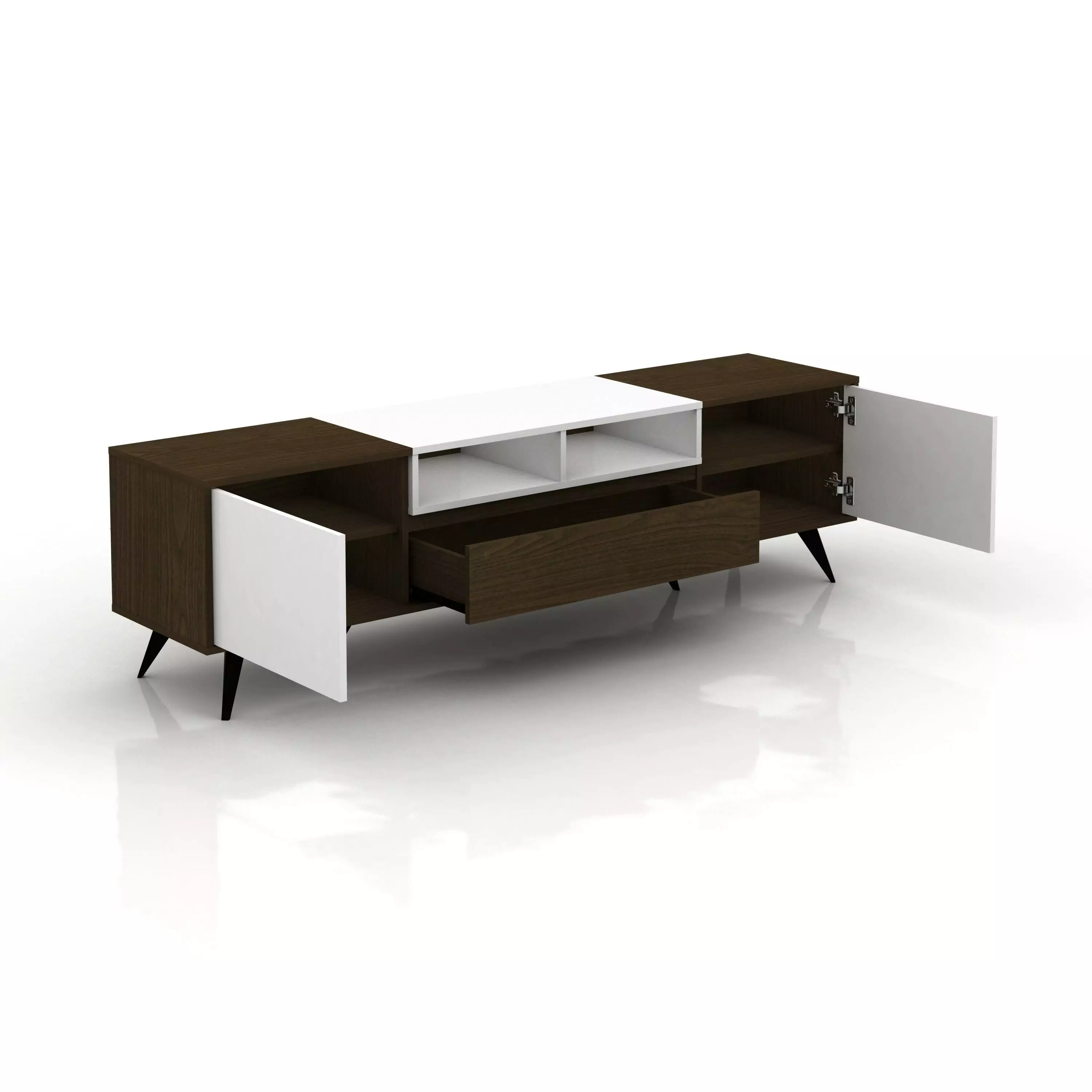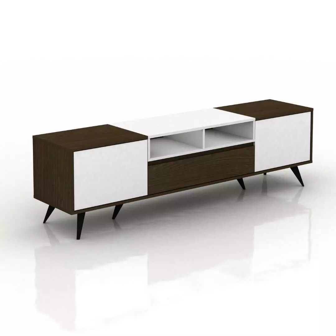 طاولة تلفزيون ريبيل - ابيض وبني، صناعة ماليزية عالية الجودة ليعطي سطح ناعم سهل التنظيف ومتين مقاوم للخدوش والعوامل الجوية، تجعل مخارج الأسلاك من السهل تمرير الأسلاك والوصلات من الخلف لتكون بعيدة عن الأنظار وفي المتناول في نفس الوقت. مزودة برفوف من أجل مشغل الـ DVD وألعاب الفيديو وحفظ أجهزة التحكم عن بعد، وأجهزة الألعاب وغيرها من ملحقات التلفزيون بشكل منظّم.