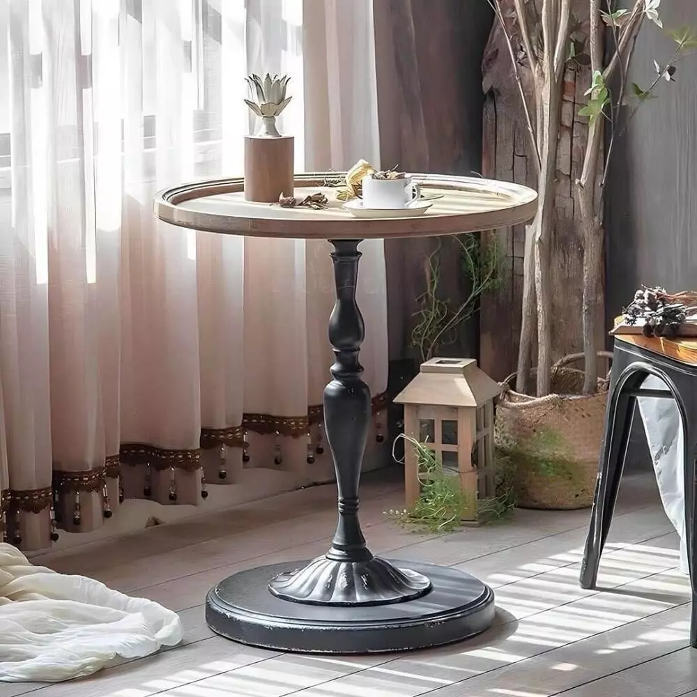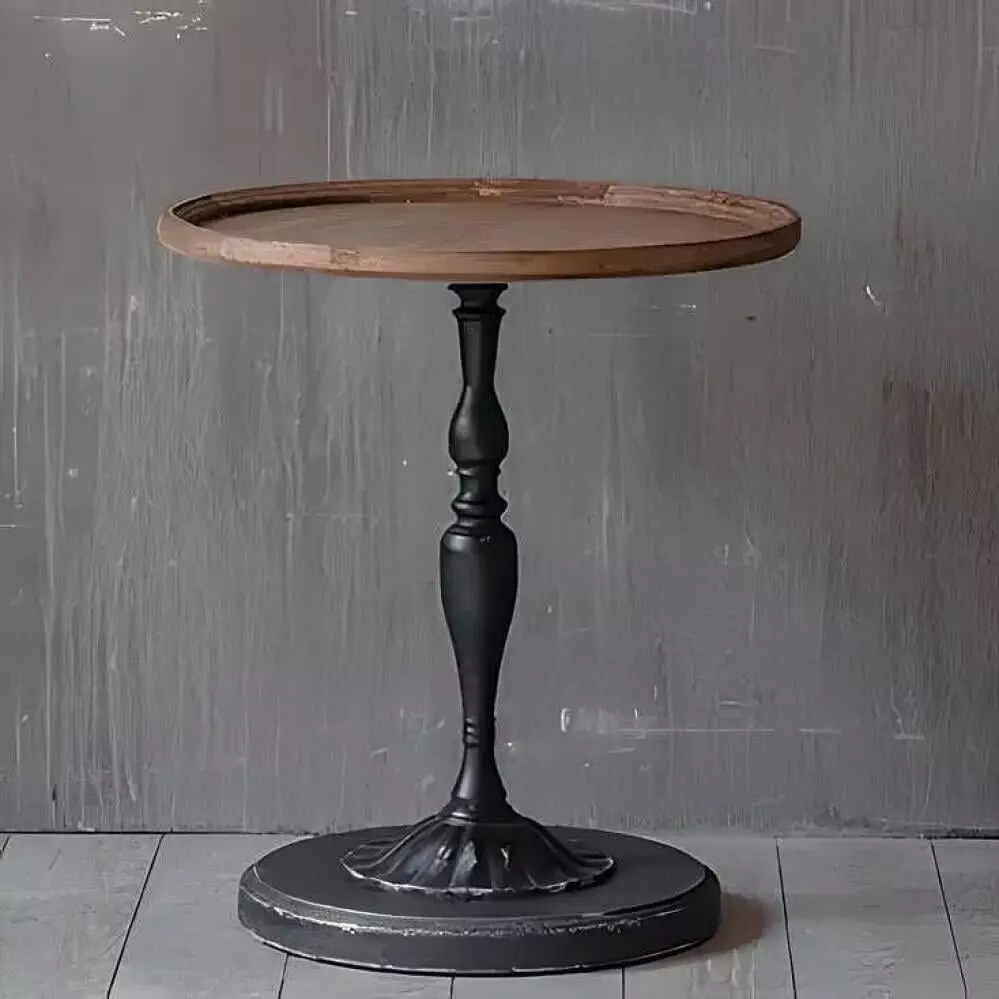 طاولة جانبية خشب وحديد فلاي بتصميم دائري مميز يجمع بين الطابع الريفي والمظهر العصري، مصنوعة من الخشب الطبيعي والحديد.