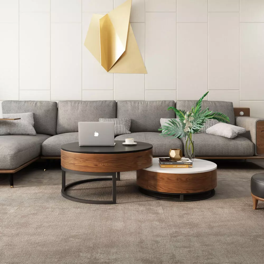 أبعاد طاولة القهوة: القطر 80 x السمك 15 x الارتفاع 40-56 سم أبعاد الطاولة الجانبية: القطر 70 x السمك 16.5 x الارتفاع 23 سم أبعاد وحدة الأدراج: الطول 42 x العرض 37.5 x الارتفاع 8 سم أبعاد الوحدة الداخلية: الطول 51 x العرض 51 x الارتفاع 12 سم |