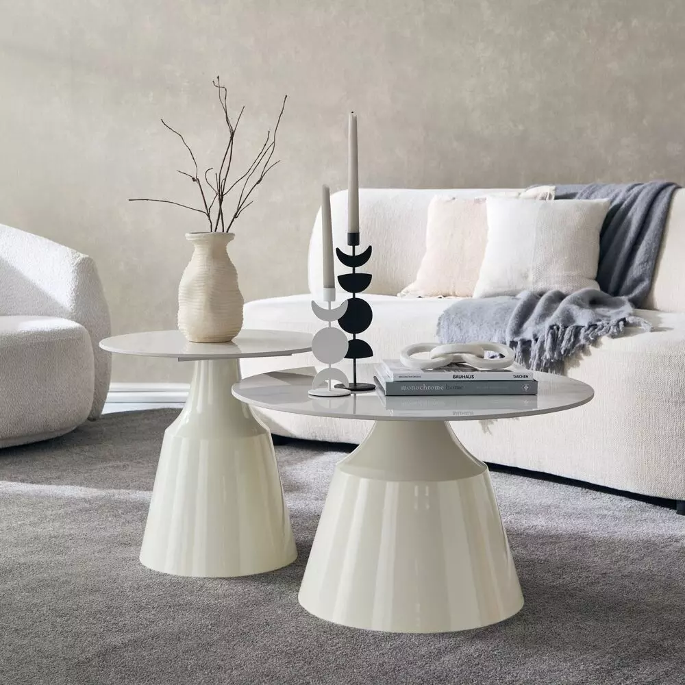 طاولة 1 القُطر: 70 سم x الوزن: 9.5 كجم x الارتفاع: 43 سم طاولة 2 القُطر: 50 سم x الوزن: 9.5 كجم x الارتفاع: 47.5 سم |