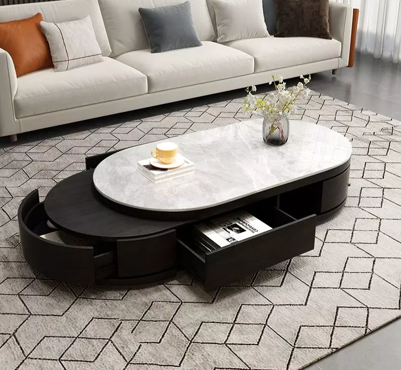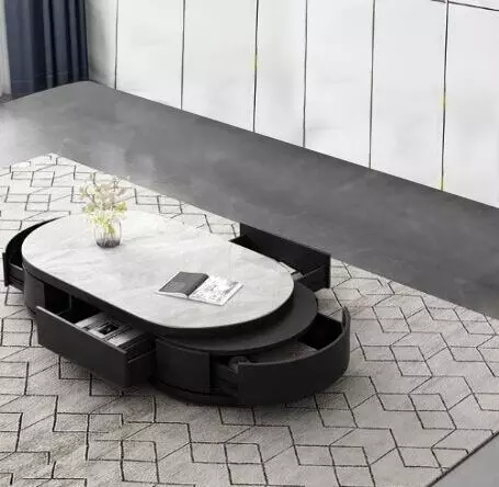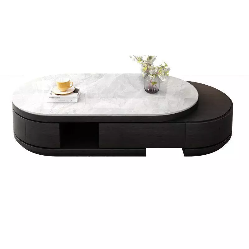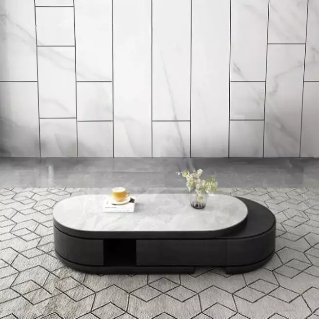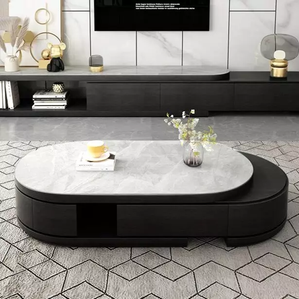 طاولة قهوة شينا - رمادي واسود تتميز بتصميمها البيضاوي الأنيق الذي يضيف لمسة فريدة إلى أي مساحة. الشكل البيضاوي يعزز من سهولة التنقل حول الطاولة ويوفر مساحة واسعة لوضع الأكواب والكتب والمجلات، مما يجعلها مثالية للاستخدام اليومي.