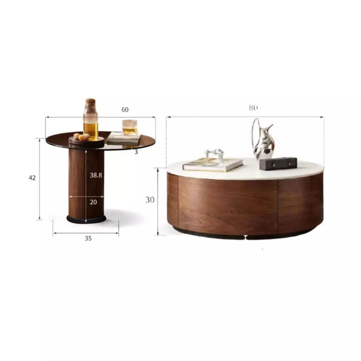 | أبعاد طاولة القهوة | القسم المرتفع: ارتفاع 42 سم * قطر علوي 60 سم * قطر سفلي 35 سم, القسم المنخفض: ارتفاع 30 سم * قطر 80 سم |