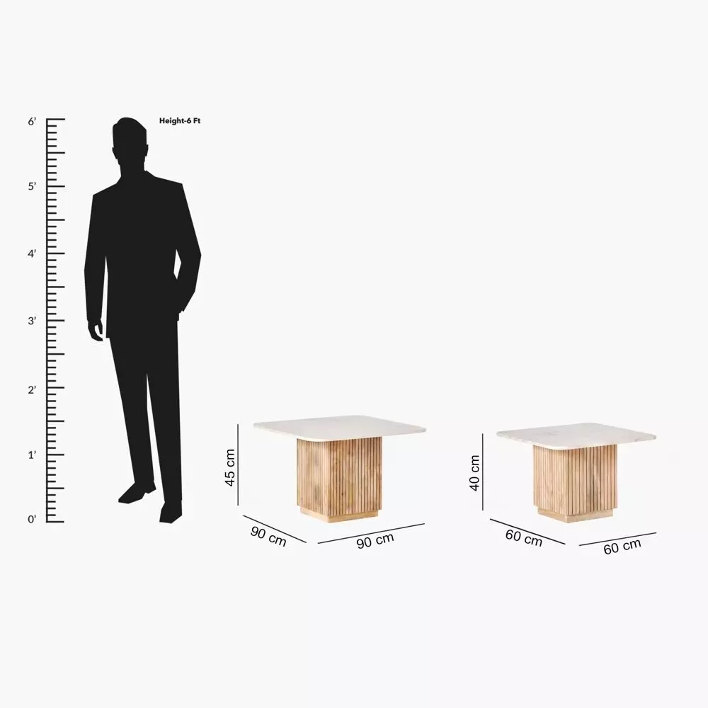 طاولة 1 العمق: 90 سم x الارتفاع: 45 سم x العرض: 90 سم طاولة 2 العمق: 60 سم x الارتفاع: 40 سم x العرض: 60 سم |