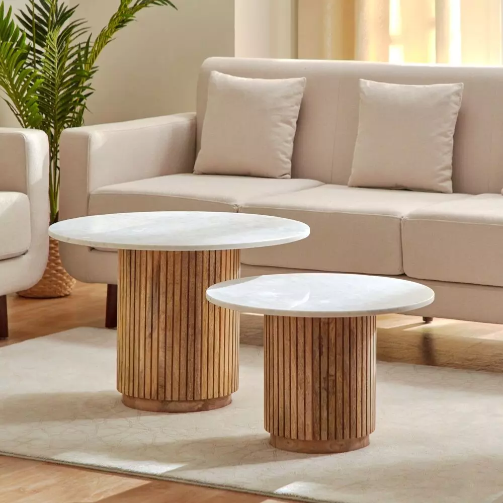 طاولة قهوة مستديرة من الرخام الأصلي من قطعتين مع قاعدة من الخشب الصلب