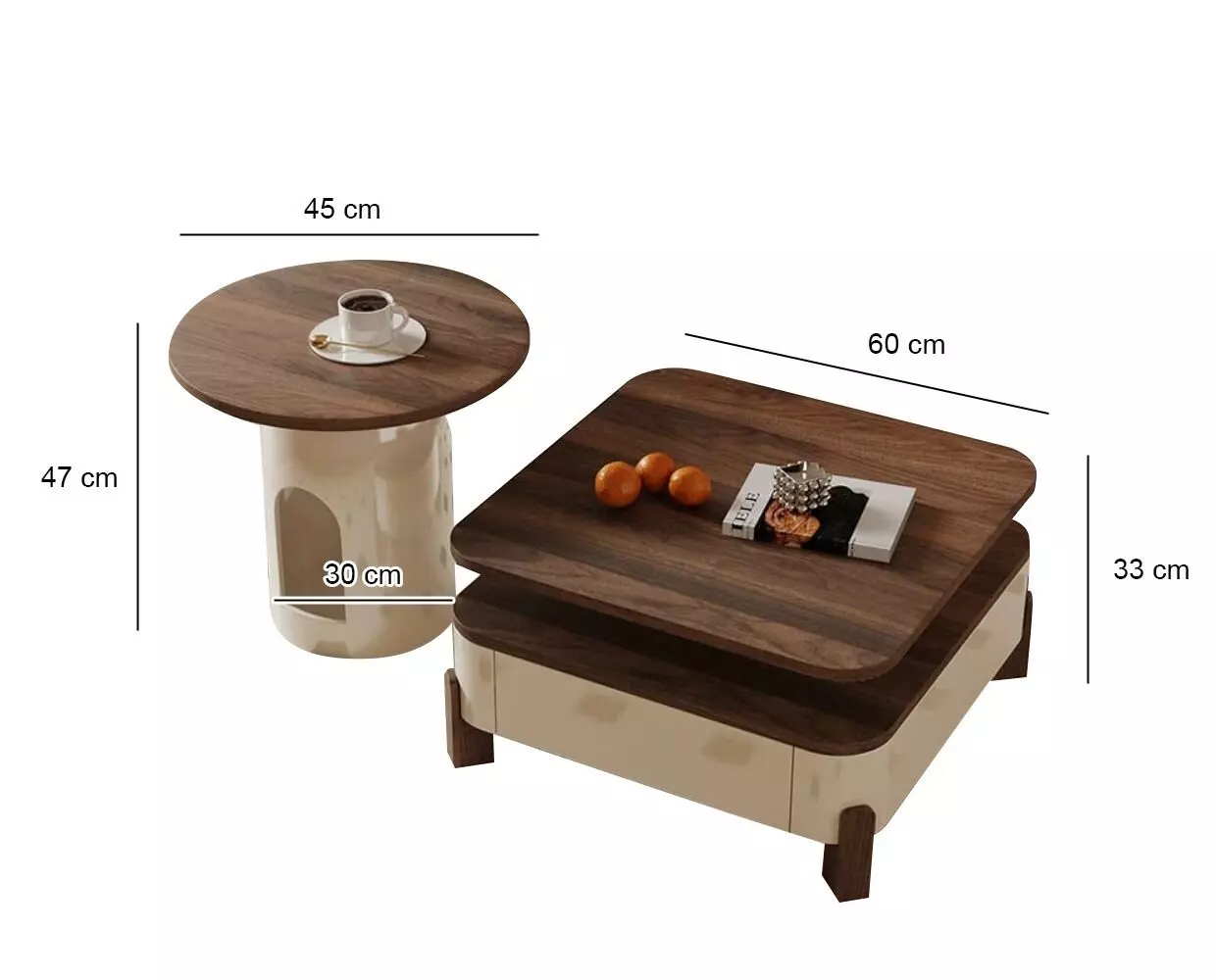 | مقاسات المنتج | الطاولة الكبيرة : العرض 60 سم، الارتفاع 33 سم - الطاولة الصغيرة : السطح العلوي قطر 45 سم، القاعدة قطر 30 سم،الارتفاع 47 سم |