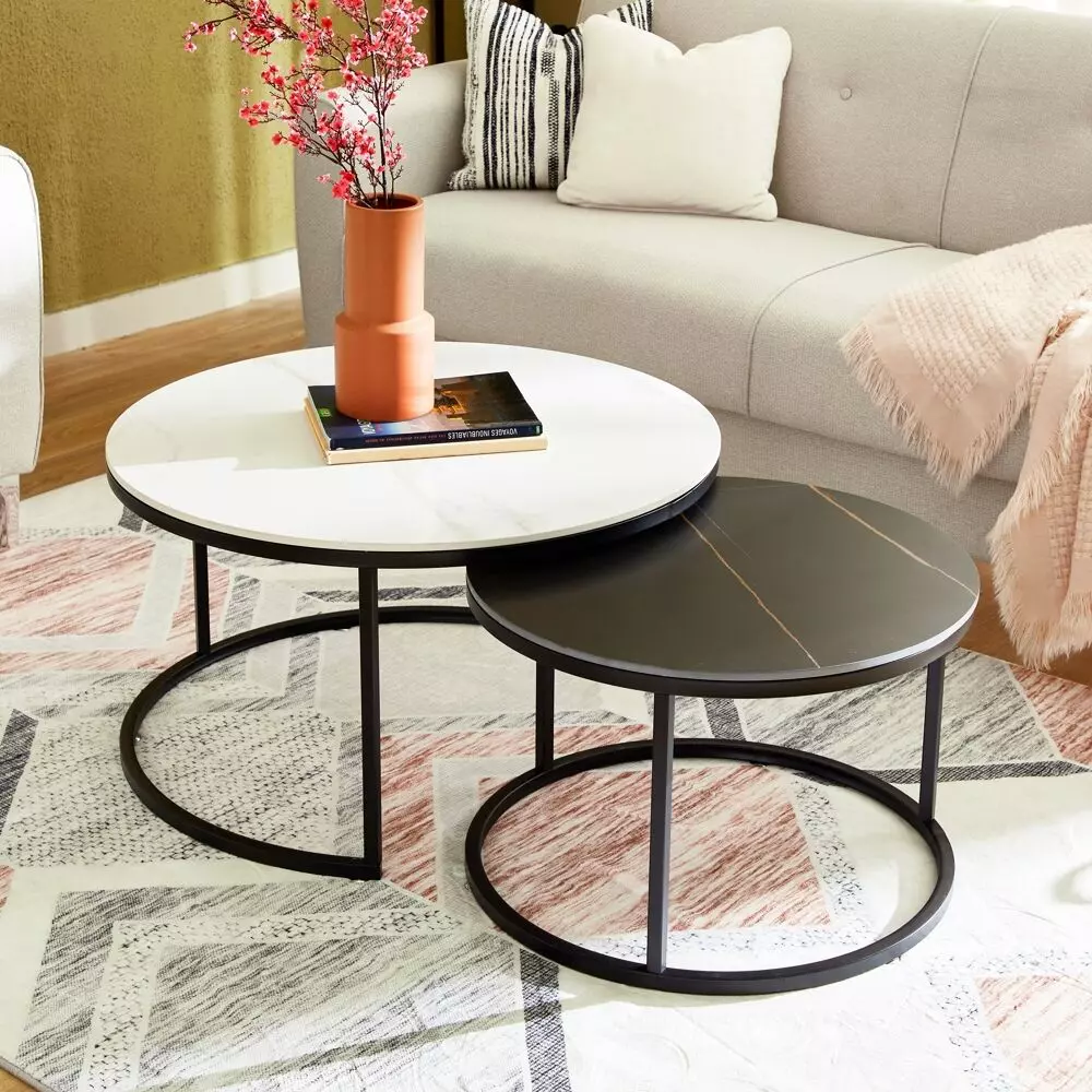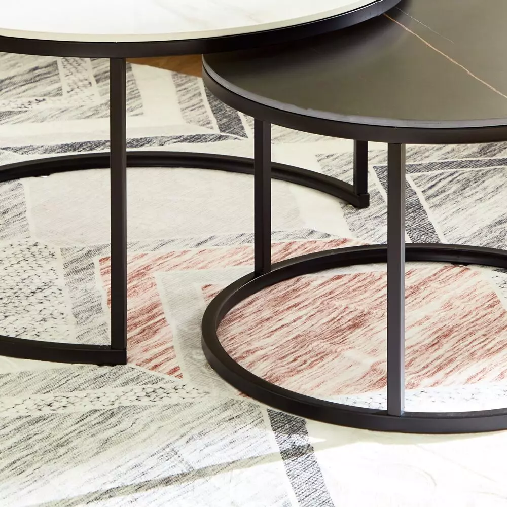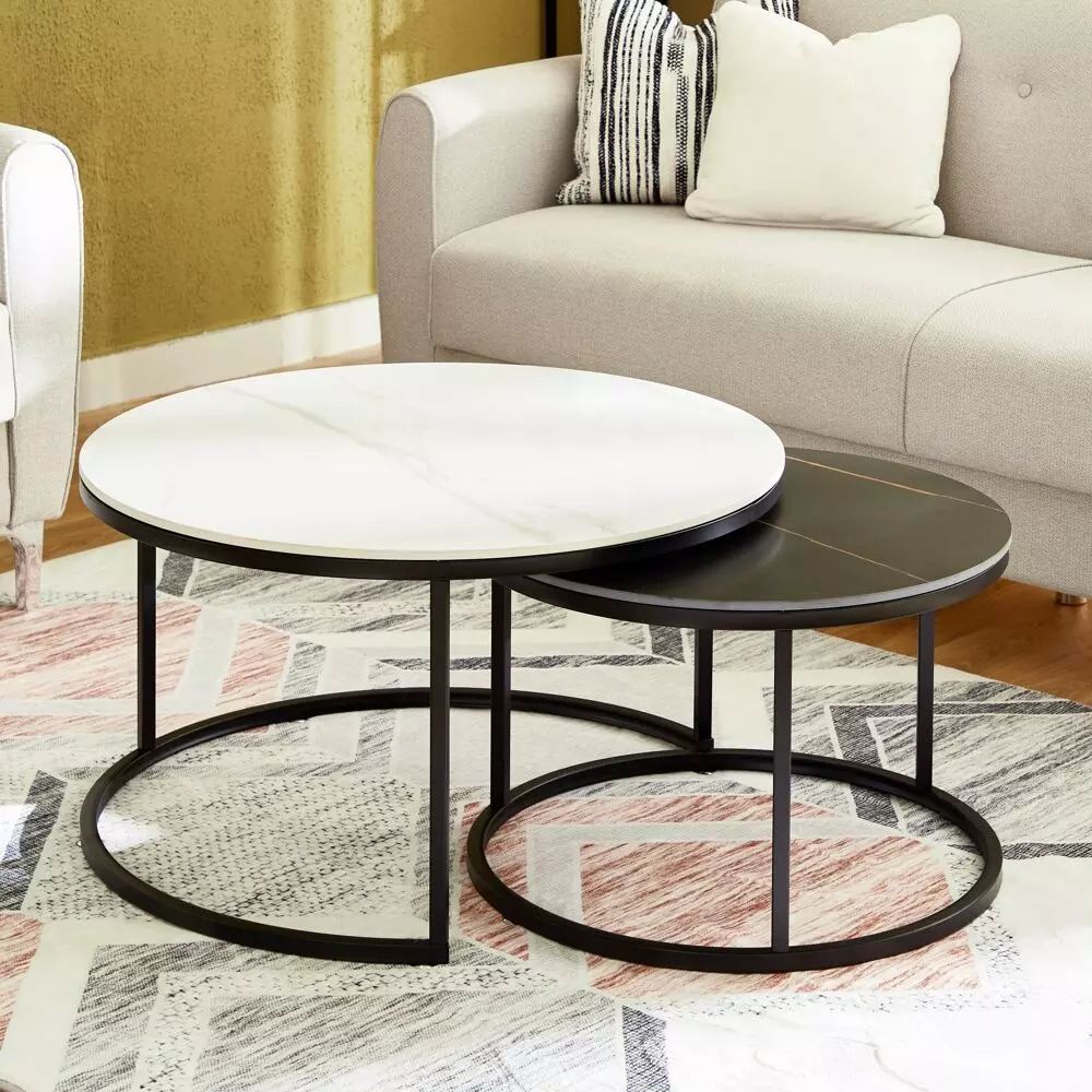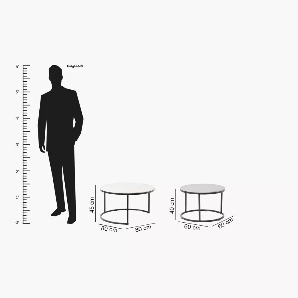 طاولة 1 الوزن: 27.4 كجم x القطر: 80 سم x الارتفاع: 45 سم طاولة 2 الوزن: 27.4 كجم x القطر: 60 سم x الارتفاع: 40 سم |