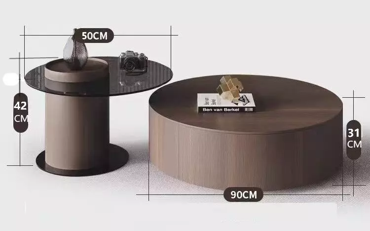 أبعاد طاولة القهوة: العرض: 90 سم، الارتفاع: 31 سم أبعاد الطاولة الجانبية: العرض: 50 سم، الارتفاع: 42 سم مقاس الحجم الكبير: القطر: 90 سم، الارتفاع: 31 سم مقاس الحجم الصغير: القطر: 50 سم، الارتفاع: 42 سم |