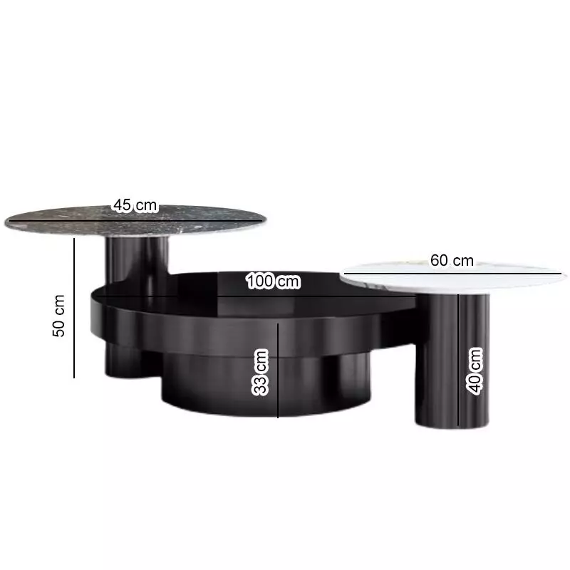 الطاولة الاولى : القطر 100 - الارتفاع 33 الطاولة الثانية : القطر 60 - الارتفاع 40 سم الطاولة الثالثة : القطر 45 - الارتفاع 50 سم |