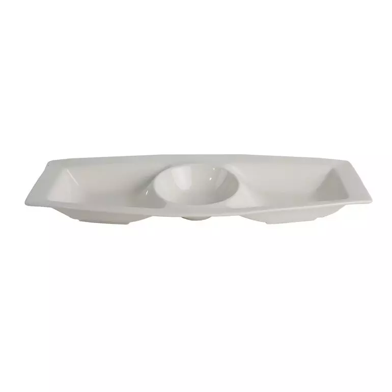 طبق مستطيل الشكل مقسم إلى 3 أقسام مصنوع من البورسلان باللون الأبيض, مناسب لإحتواء مختلف الأصناف, وهو إختيار مثالي لتقديم وتنسيق الأطعمة بشكل جميل ومنظم.