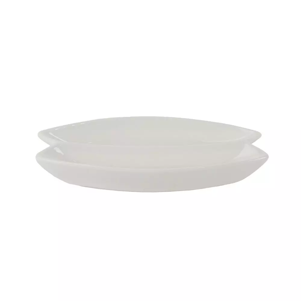 طبق تقديم مستطيل الشكل مقسم إلى قسمين مصنوع من البورسلان باللون الأبيض, مناسب لإحتواء مختلف الأصناف, إختيار مثالي لتقديم وتنسيق الأطعمة بشكل جميل ومنظم.