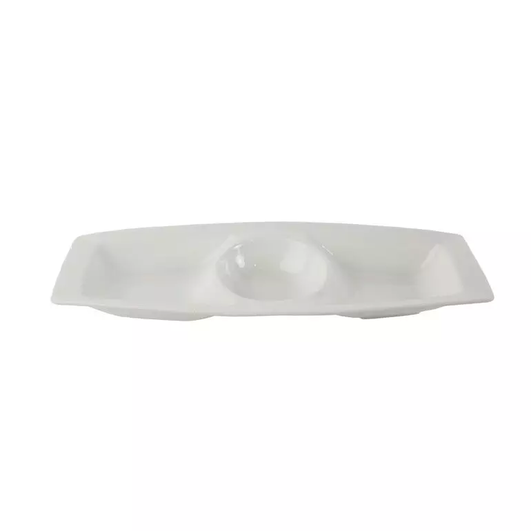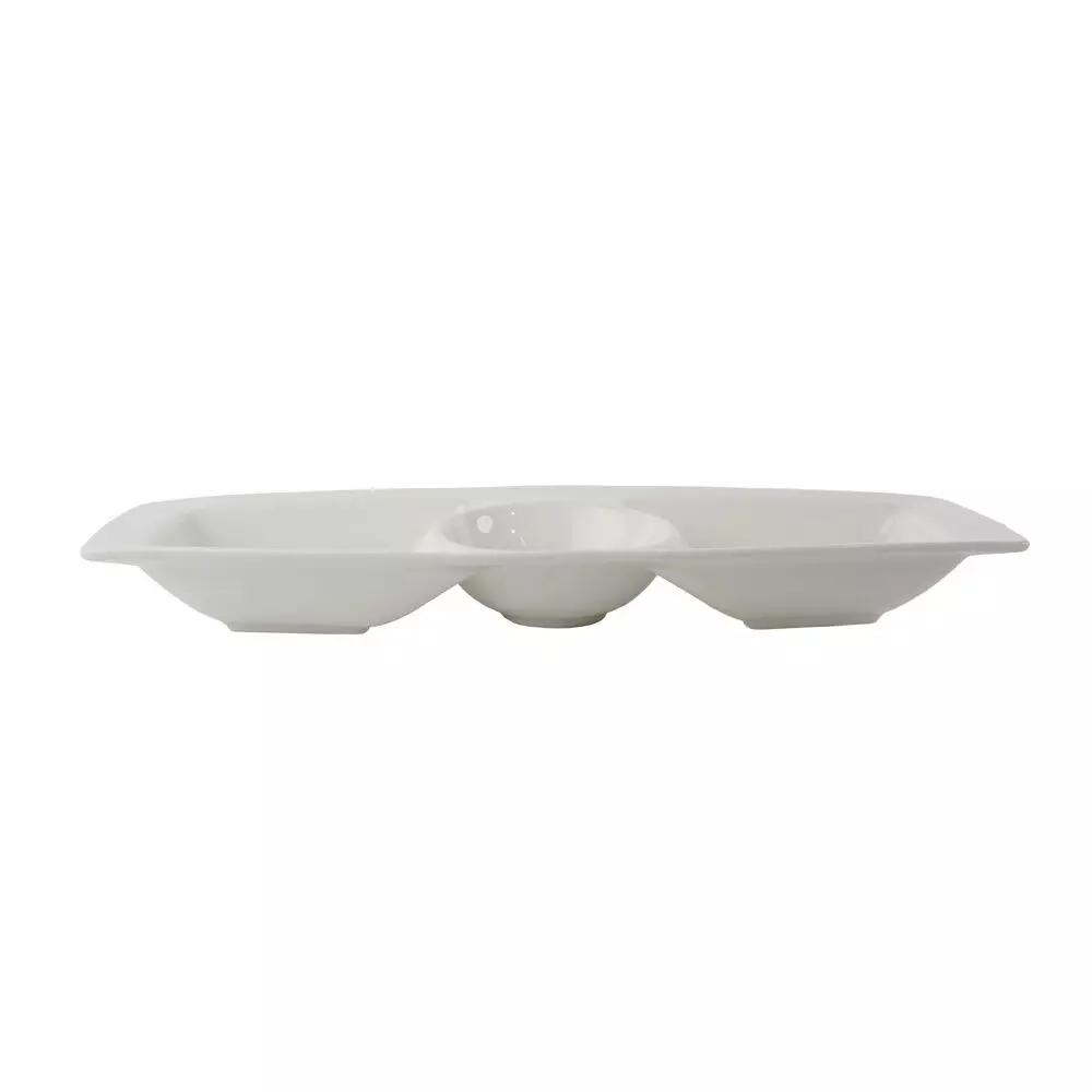 طبق تقديم مستطيل الشكل مقسم إلى 3 أقسام مصنوع من البورسلان باللون الأبيض, مناسب لإحتواء مختلف الأصناف و هو إختيار مثالي لتقديم وتنسيق الأطعمة بشكل جميل ومنظم.