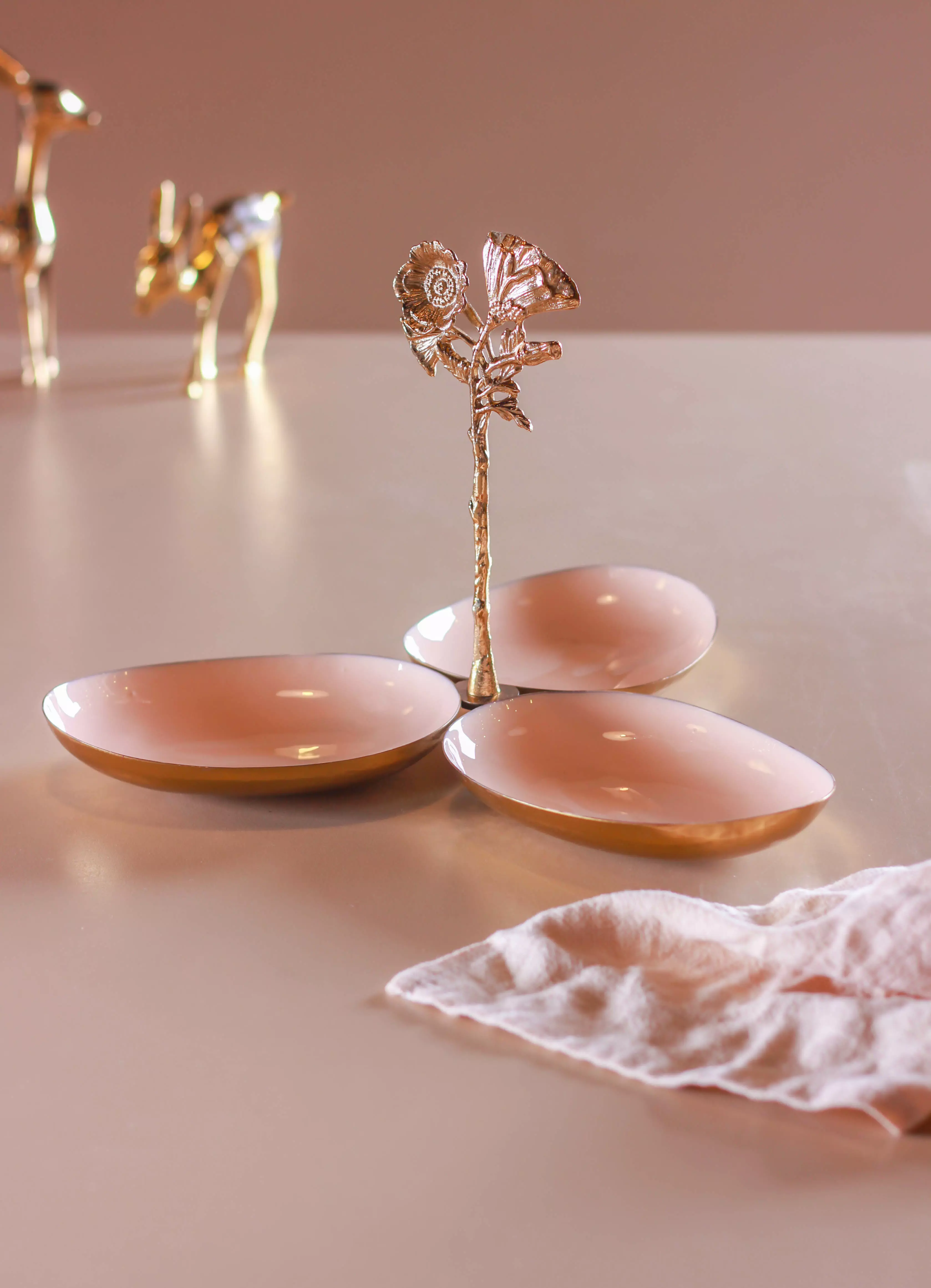 طبق تقديم ثلاثي عصري بتصميم عملي يجمع بين الأناقة والفخامة. مصنوع من الستيل الهندي العالي الجودة فالمعادن الهندية من أجود أنواع المعادن في العالم وأكثرها متانة ومصنوع يدوياً بمهارة ودقة من قبل الحرفيين المهرة. الطبق مقسم إلى ثلاثة أقسام متساوية الحجم مما يمكنك من تقديم أنواع متنوعة من الضيافة ك التمور مع الصلصة أو الحلى مع الشوكولاه بأنواعها المختلفة وغيرها. سطح الطبق مصقول ليكون سهل التنظيف ومطلي بطلاء ثابت مع الزمن وصحي للأغذية. الطبق مزود بحامل مزخرف يسهل عليك حمل الطبق.