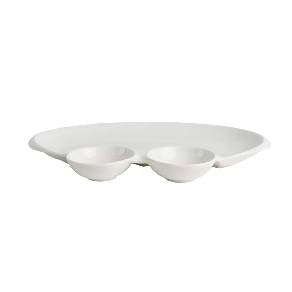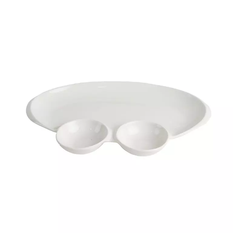 طبق تقديم دائري الشكل مقسم إلى ثلاث أقسام مصنوع من البورسلان باللون الأبيض مناسب لإحتواء مختلف الأصناف، وهو إختيار مثالي لتقديم وتنسيق الأطعمة بشكل جميل ومنظم.