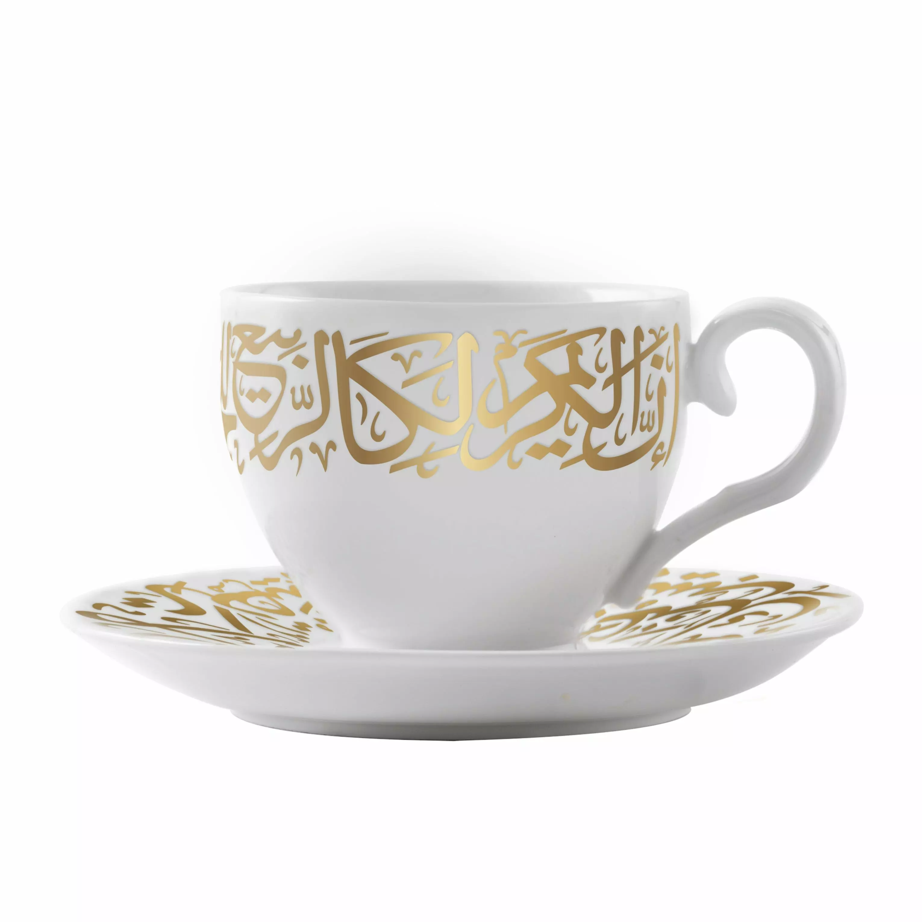 طقم بيالات شاي بتصميم فاخر مستوحى من الثقافة والتراث العربي العريق يضفي لمسات فخمة على مجموعة الضيافة الخاصة بك. طقم بيالات شاي مصنوع من خامات عالية الجودة ومتينة وصحية للأغذية ومزخرف بألوان ثابتة مع الزمن. تساعد المقابض على حمل البيالة بسهولة وتحميك من سخونة الشاي وتمكنك الصحون الحاملة للبيالات من تقديم بعض قطع الضيافة مع الشاي. ينصح بغسل البيالات يدوياً بواسطة اسفنجة ناعمة للمحافظة على الزخارف والألوان.