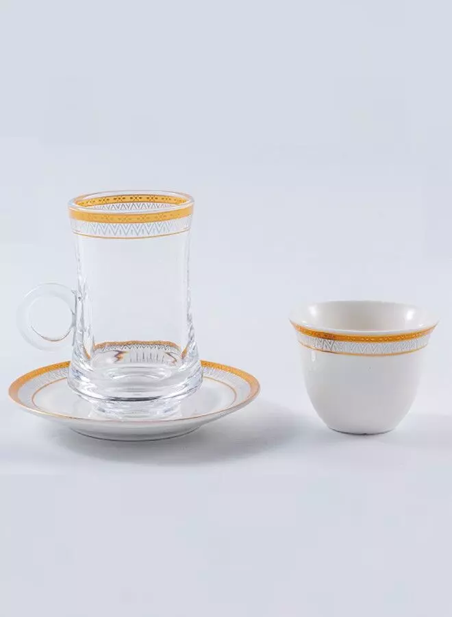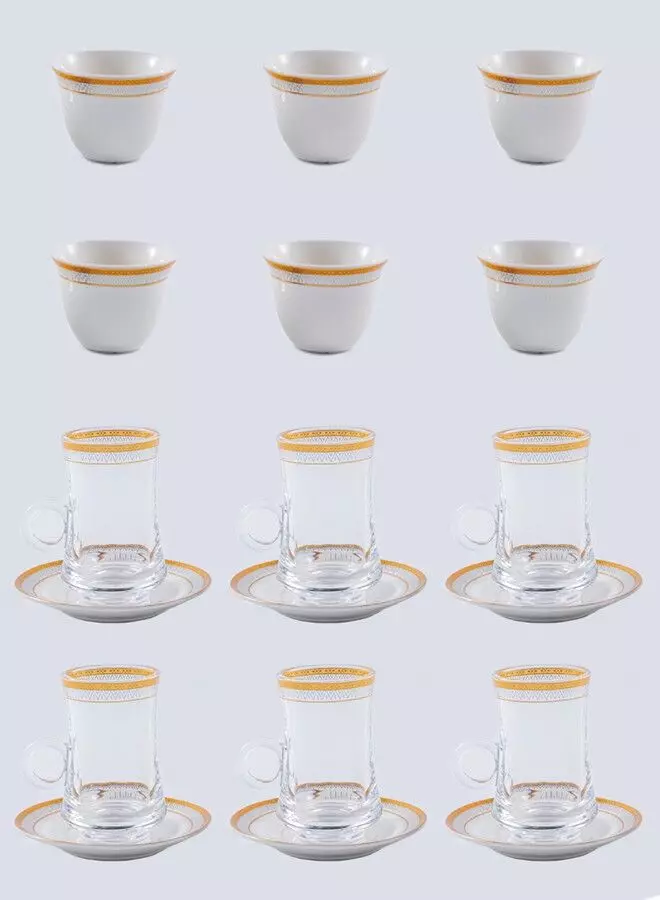 | يتضمن الطقم | 6 قطع أكواب قهوة صينية عظمية جديدة 80 مل، 6 قطع صحون صينية عظمية جديدة 4.25 بوصة، 6 قطع أكواب شاي زجاجية 120 مل. |