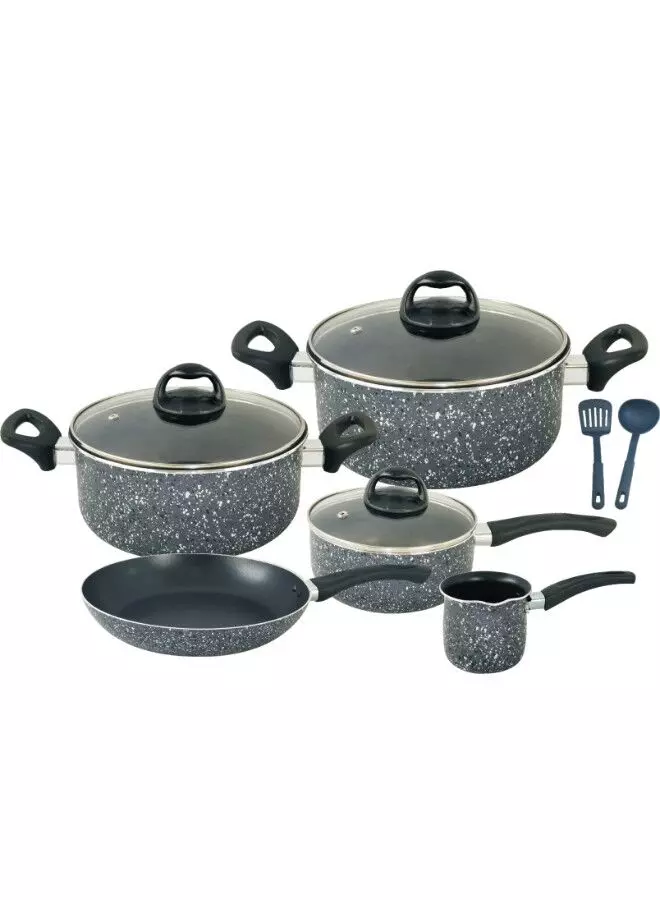طقم أواني طهي ألمنيوم 10 قطع بغطاء زجاجي ومقبض مقاوم للحرارة - أسود