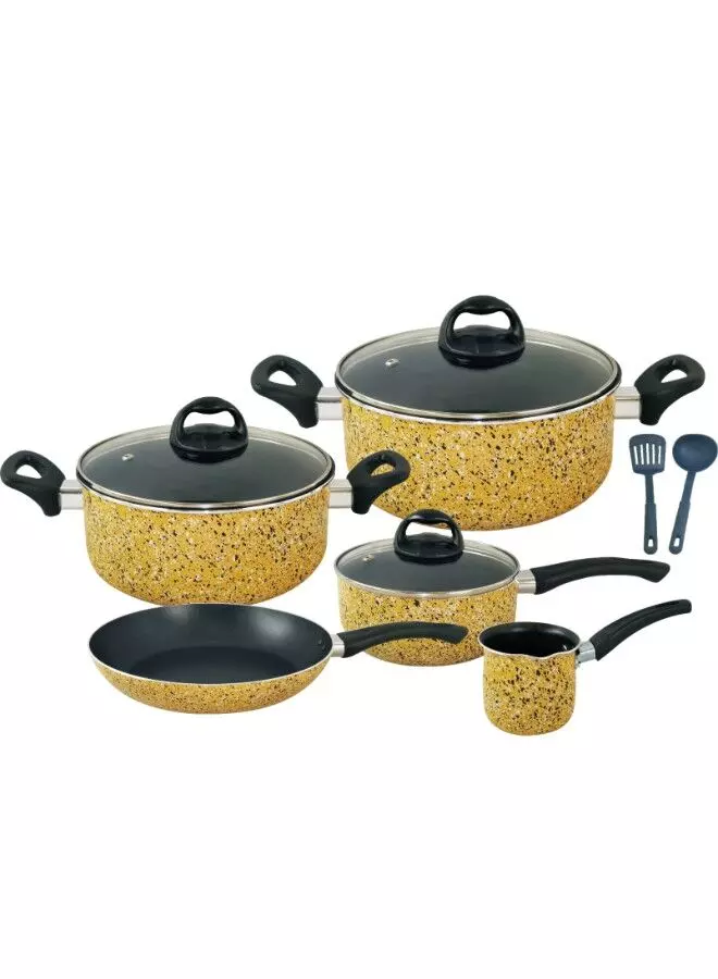 | يتضمن الطقم | 1 طنجرة كبيرة 1 طنجرة وسط 1 طنجرة بيد 1 مقلاة 1 ركوة 3 غطاء 1 مغرفة شوربة 1 ملعقة تقليب فقط |