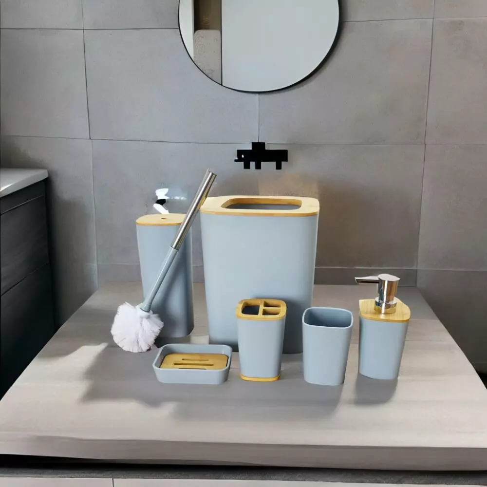 | يتضمن الطقم | موزع صابون - حامل صابون - حامل فرش الأسنان - كوب للشطف - فراشات تنظيف المرحاض - سلة للمهملات |