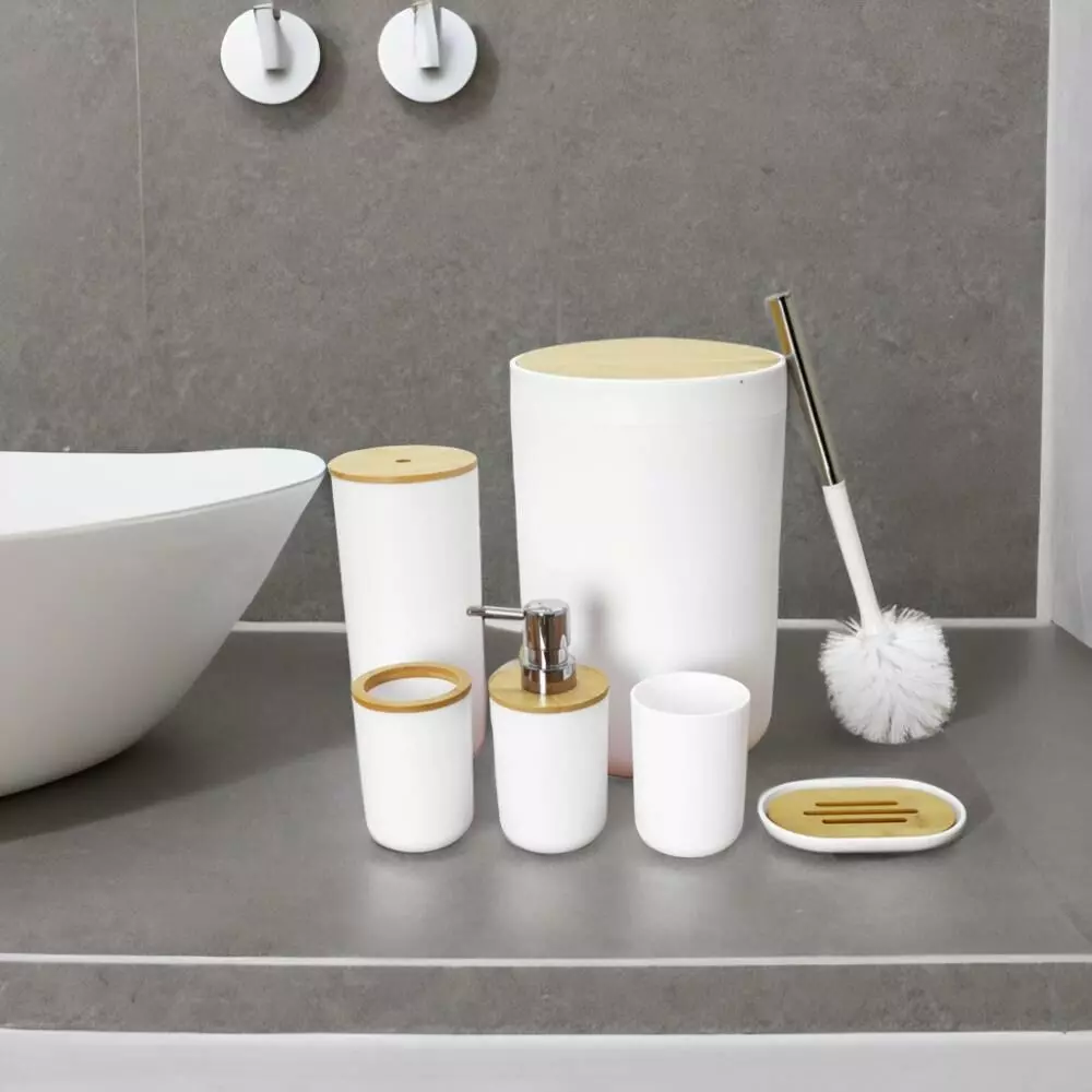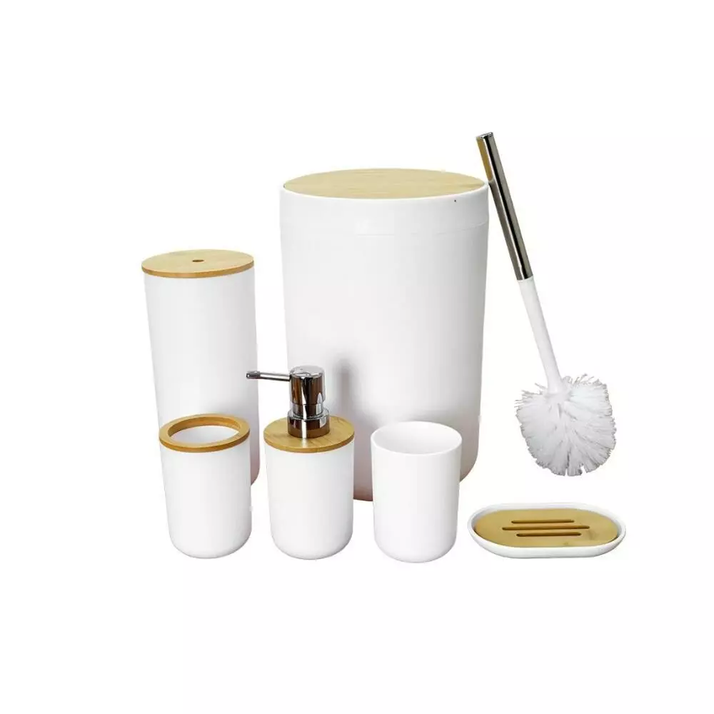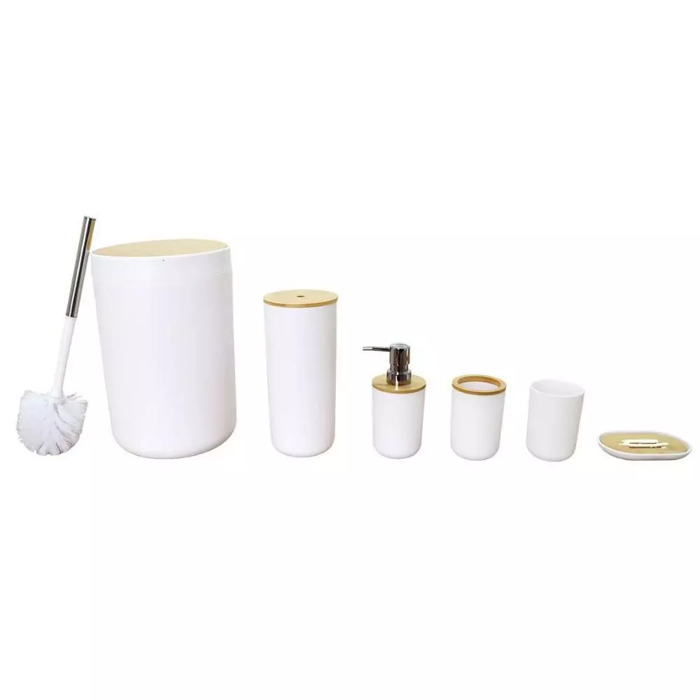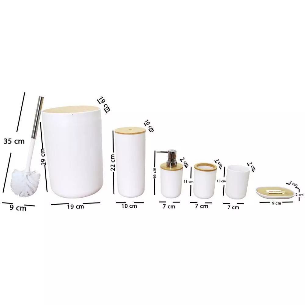 | يتضمن الطقم | موزع صابون - حامل صابون - حامل فرش الأسنان - كوب للشطف - فراشات تنظيف المرحاض - سلة للمهملات |