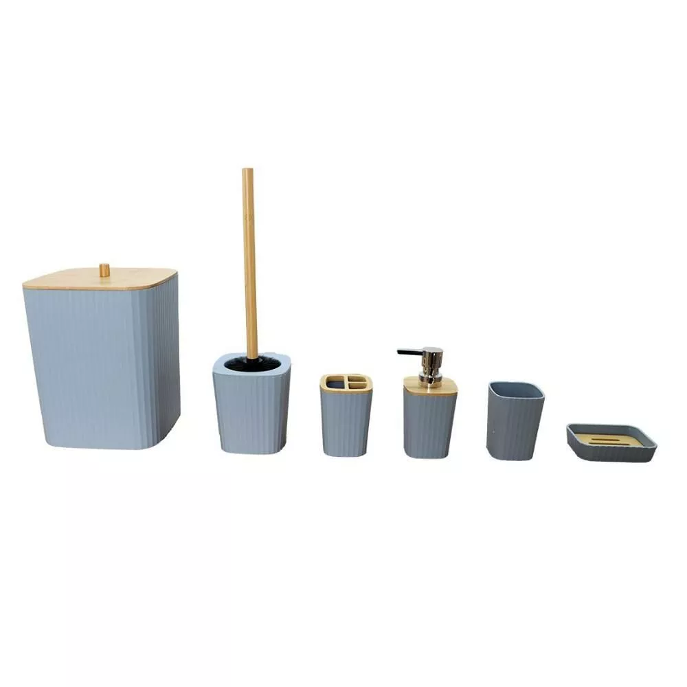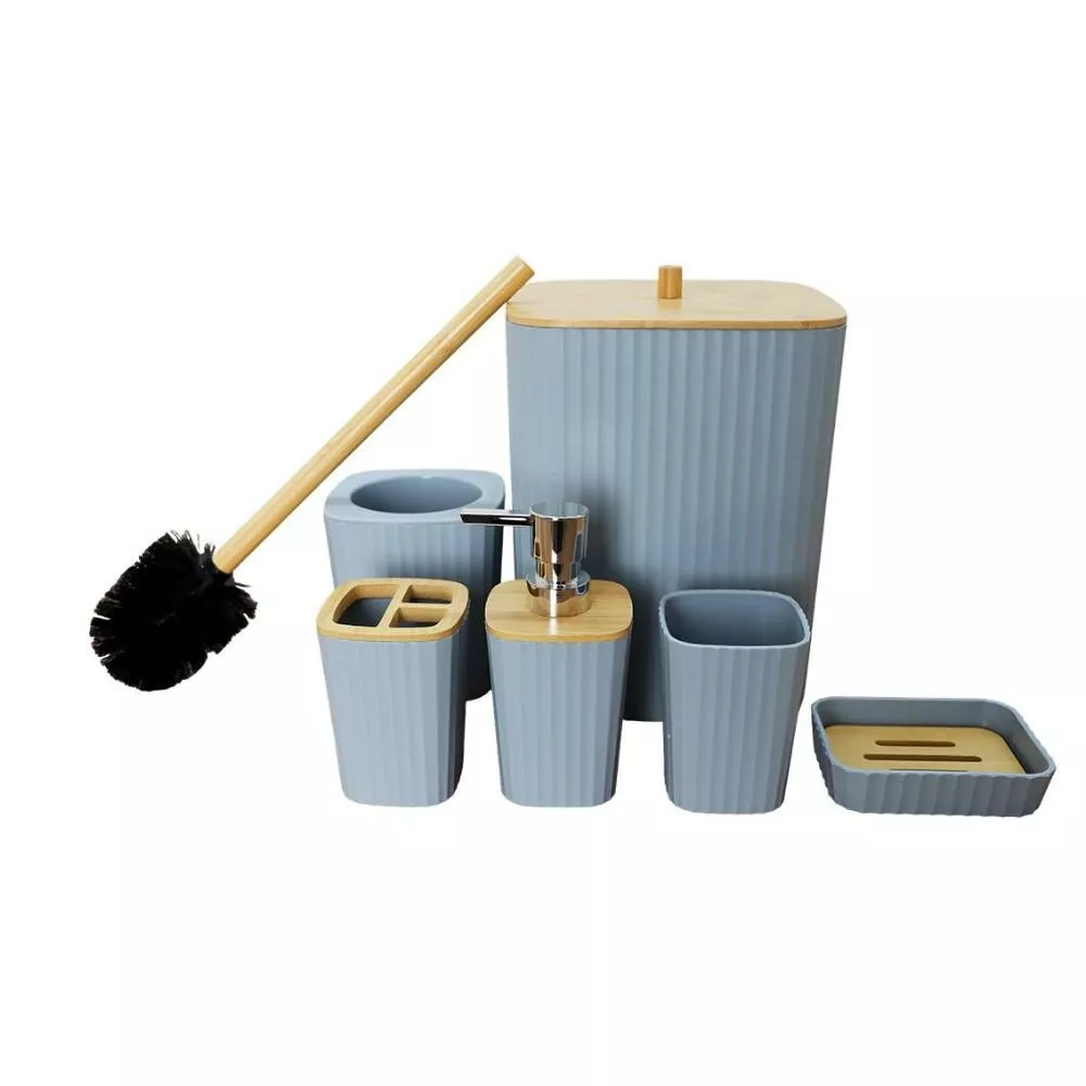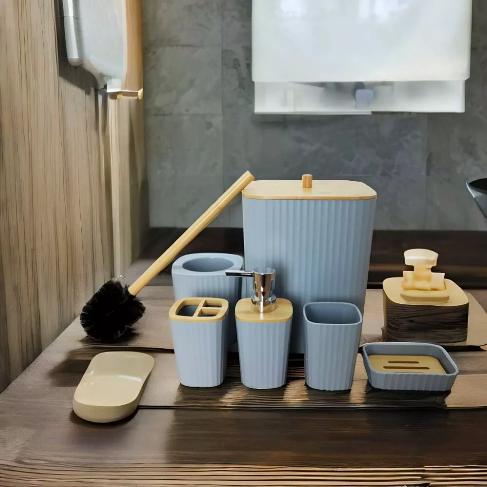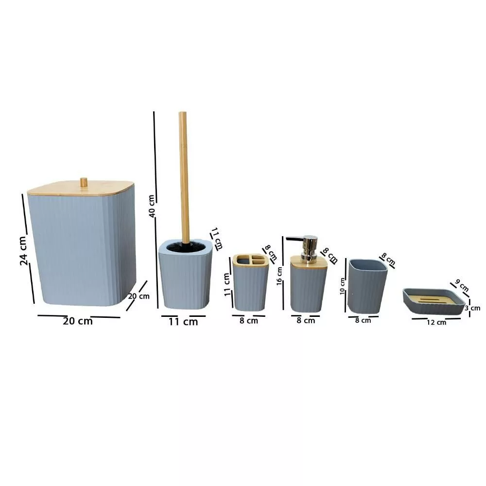 | يتضمن الطقم | موزع صابون - حامل صابون - حامل فرش الأسنان - كوب للشطف - فراشات تنظيف المرحاض - سلة للمهملات |