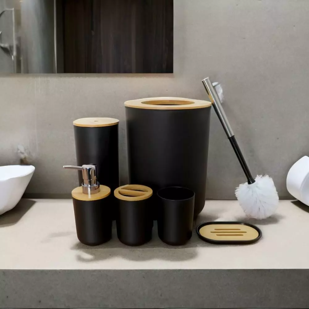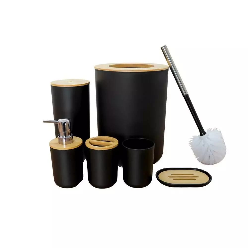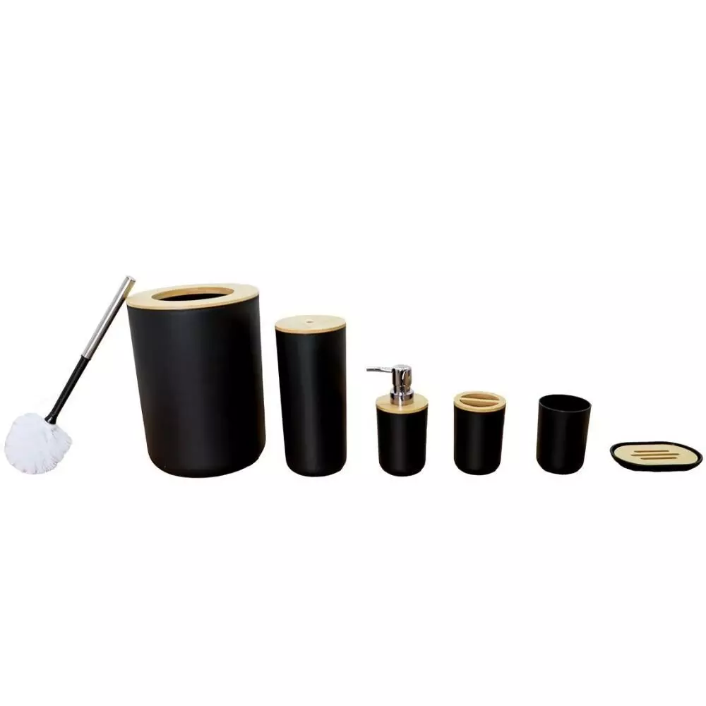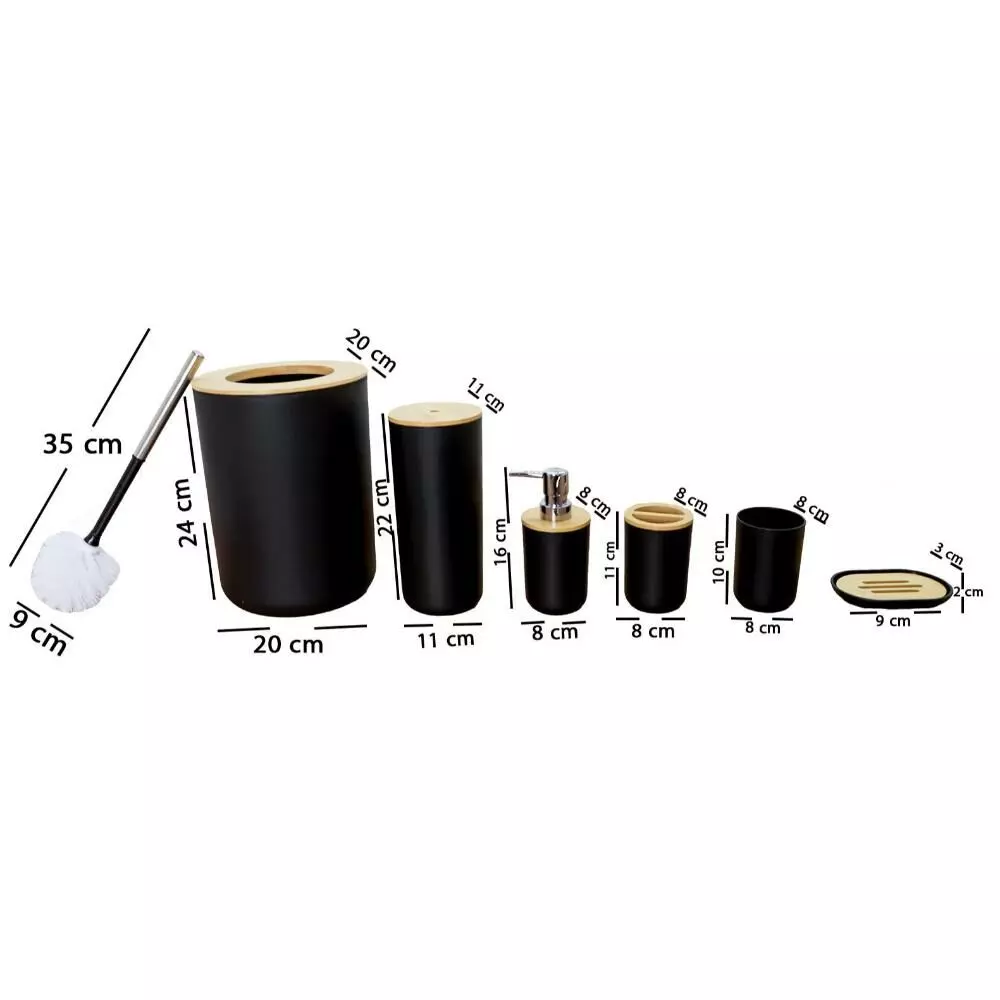 | يتضمن الطقم | موزع صابون - حامل صابون - حامل فرش الأسنان - كوب للشطف - فراشات تنظيف المرحاض - سلة للمهملات |