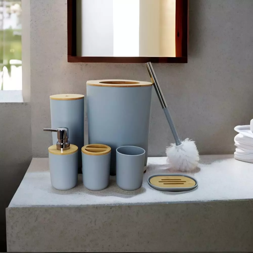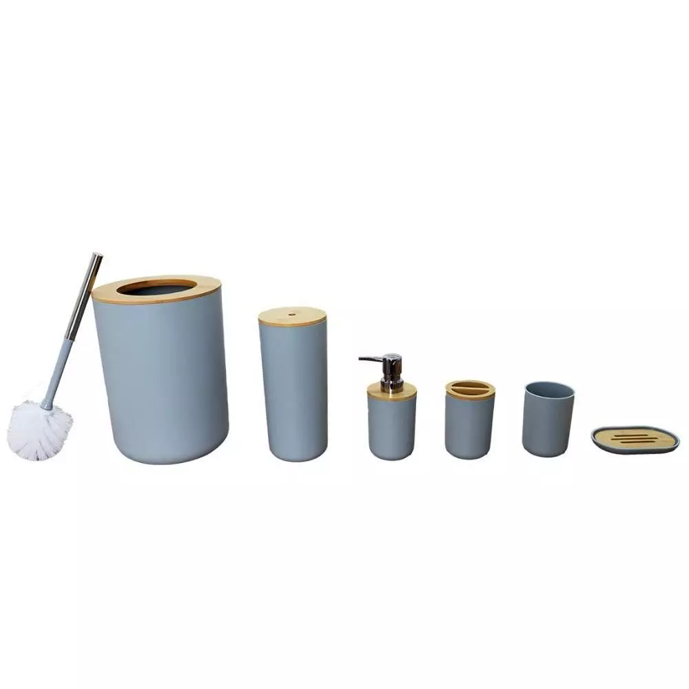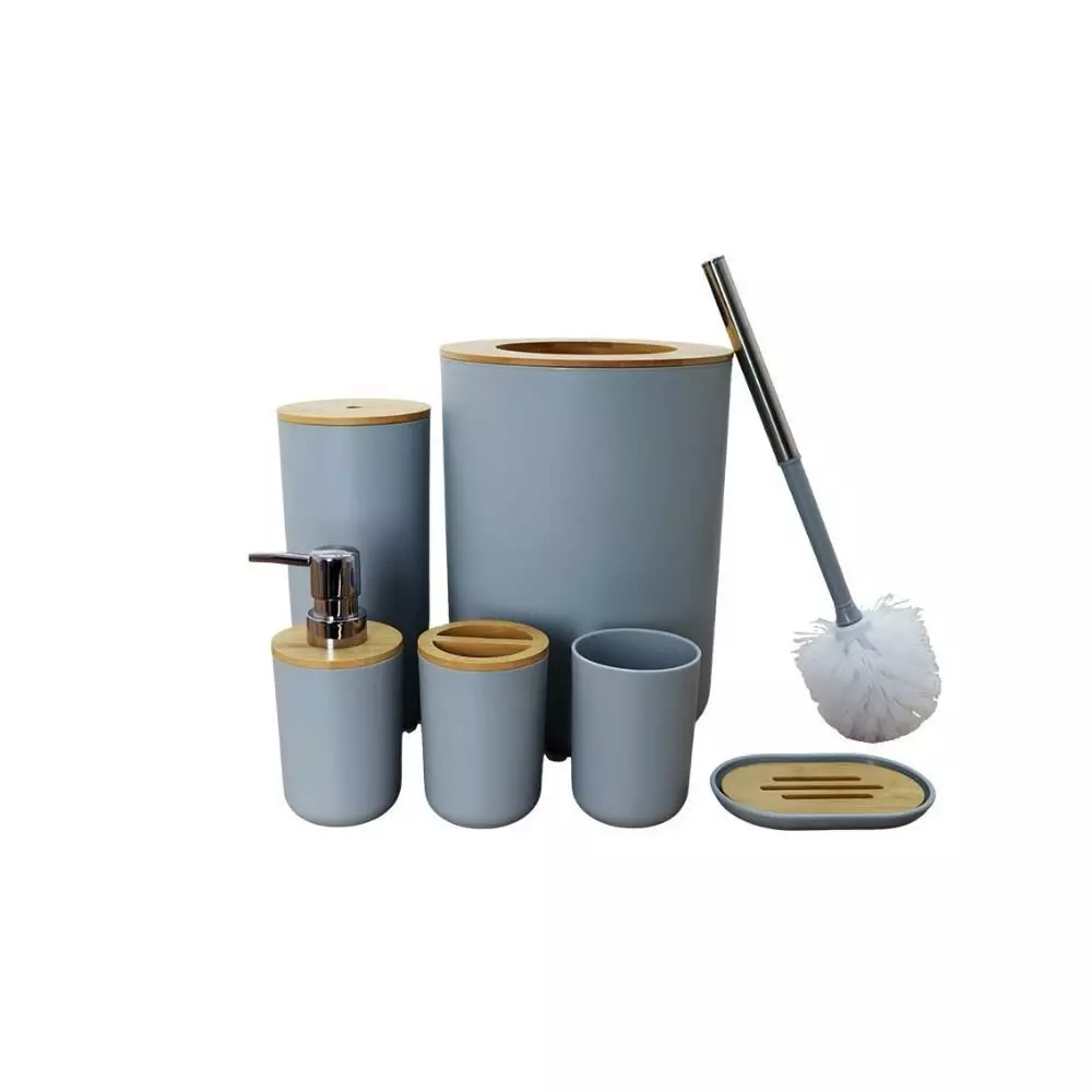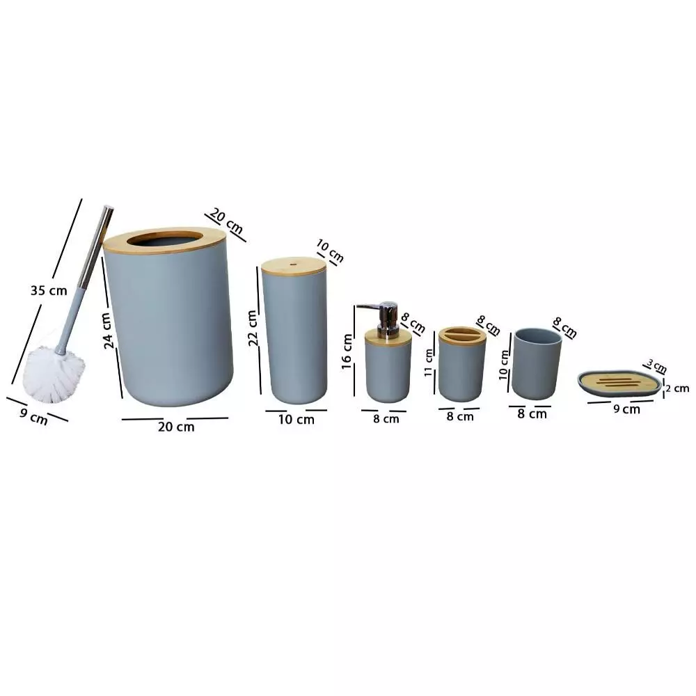 | يتضمن الطقم | موزع صابون - حامل صابون - حامل فرش الأسنان - كوب للشطف - فراشات تنظيف المرحاض - سلة للمهملات |